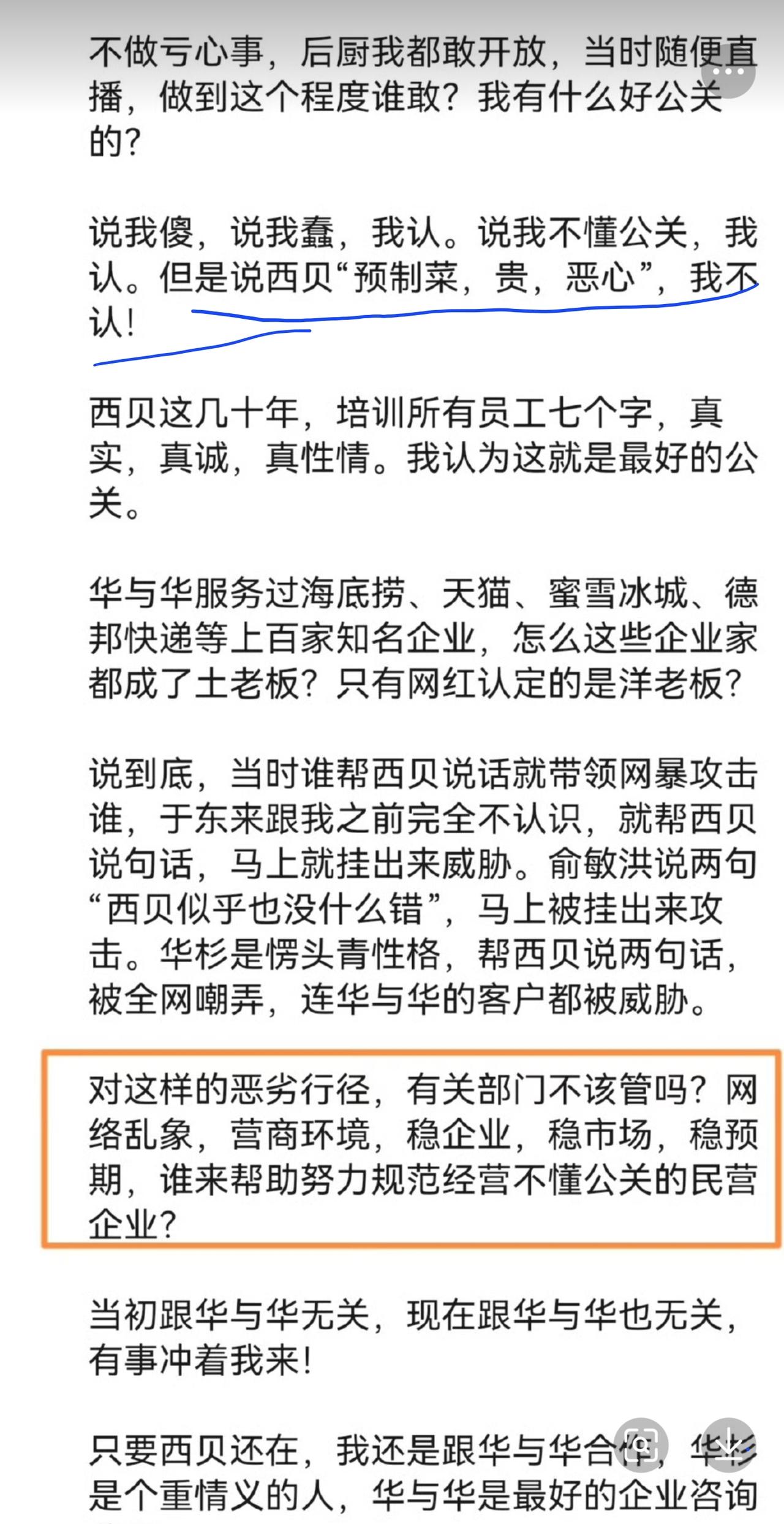 贾国龙在朋友圈里直接开炮,看来西贝的日子确实是不好过了。 之前听说他又是涨工资,又是提高待遇。他以为西贝整改之后已经缓过来了,没想到还是走下坡路,已经全国开始关店100多家了。 如今拼一拼,也可能是想在舆论上一改之前的被动,主动出击。 如果能干得过罗永浩最好,干不过大不了还是老样子。 归根结底,西贝其实还是自己的问题。 东西确实是有预制的嫌疑,并且价格还那么高。 企业低成本高利率确实能维持员工高福利,但是对于顾客来说,不买账也是正常吧?