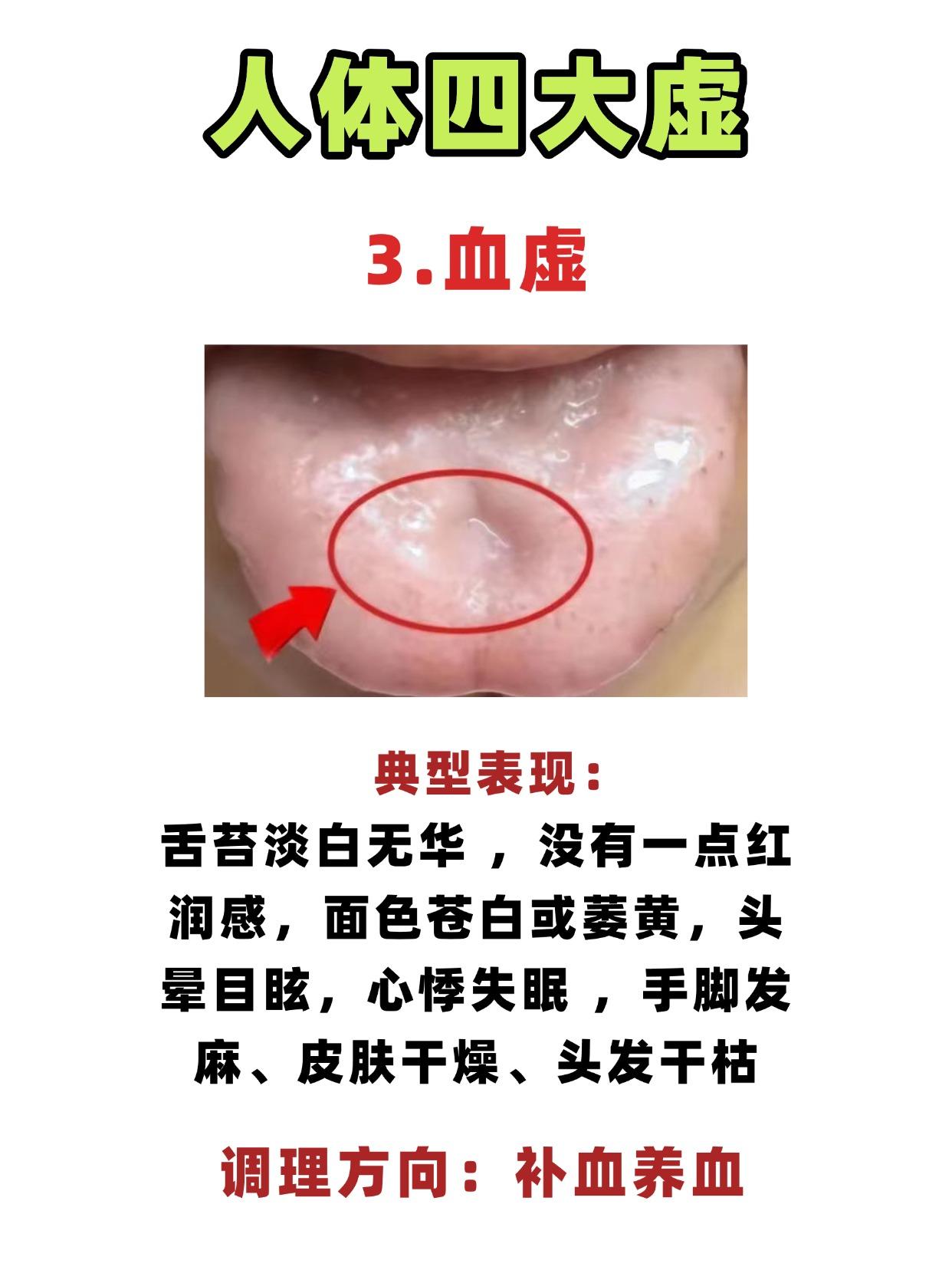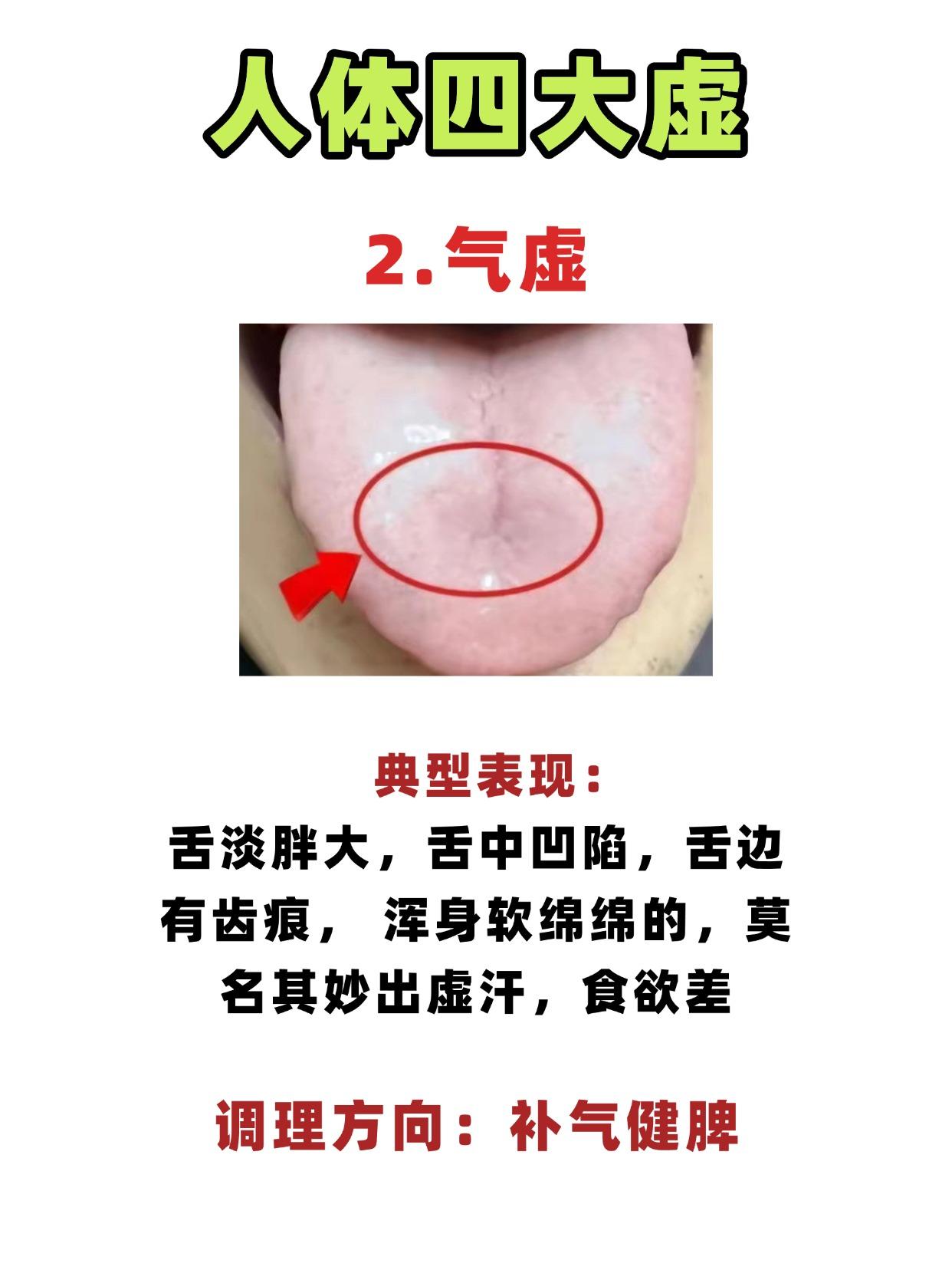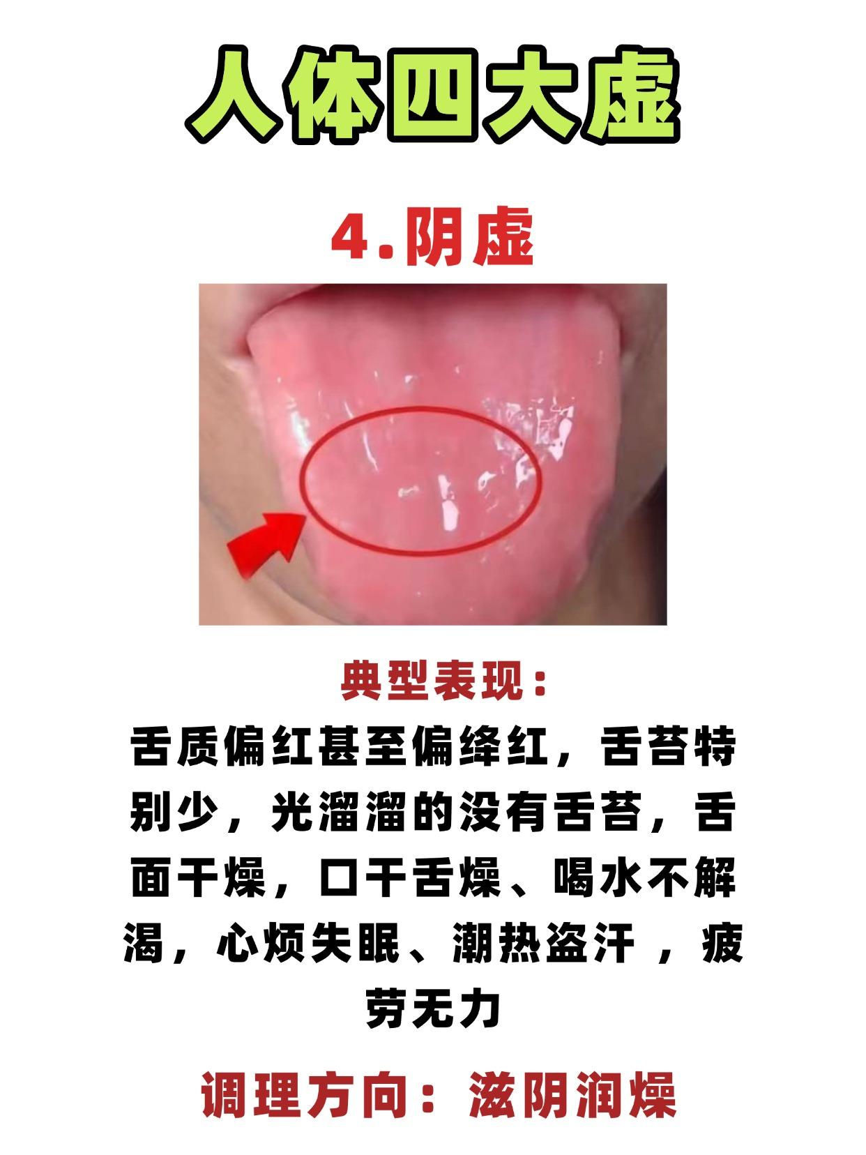 同样是 “虚”,为啥有人怕冷有人怕热?原来都是四大虚在 “捣乱”! 1.阳虚 典型表现:舌淡胖大或有齿痕,畏寒怕冷、手脚常年冰凉,腹胀腹泻、拉肚子,吃凉就犯,小便清长、夜尿多 调理方向:温补阳气、散寒祛湿 2.气虚 典型表现:舌淡胖大,舌中凹陷,舌边有齿痕,浑身软绵绵的,莫名其妙出虚汗,食欲差 调理方向:补气健脾 3.血虚 典型表现:舌苔淡白无华,没有一点红润感,面色苍白或萎黄,头晕目眩,心悸失眠,手脚发麻、皮肤干燥、头发干枯 调理方向:补血养血 4.阴虚 典型表现:舌质偏红甚至偏绛红,舌苔特别少,光溜溜的没有舌苔,舌面干燥,口干舌燥、喝水不解渴,心烦失眠、潮热盗汗,疲劳无力露 调理方向:滋阴润燥