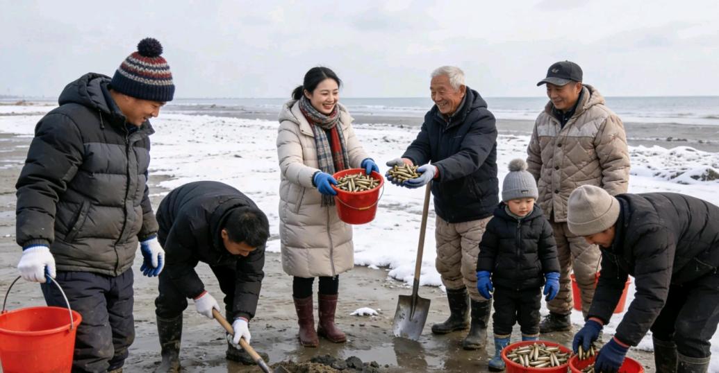 “天上下蛏子”?烟台一场罕见暴雪过后,海岸线上演了“蛏子盛宴”。 退潮后的滩涂被密密麻麻的蛏子铺满,市民们提着水桶、拿着小铲,轻松实现“蛏子自由”。有市民两小时就捡了三十斤蛏子,喜悦之情溢于言表。