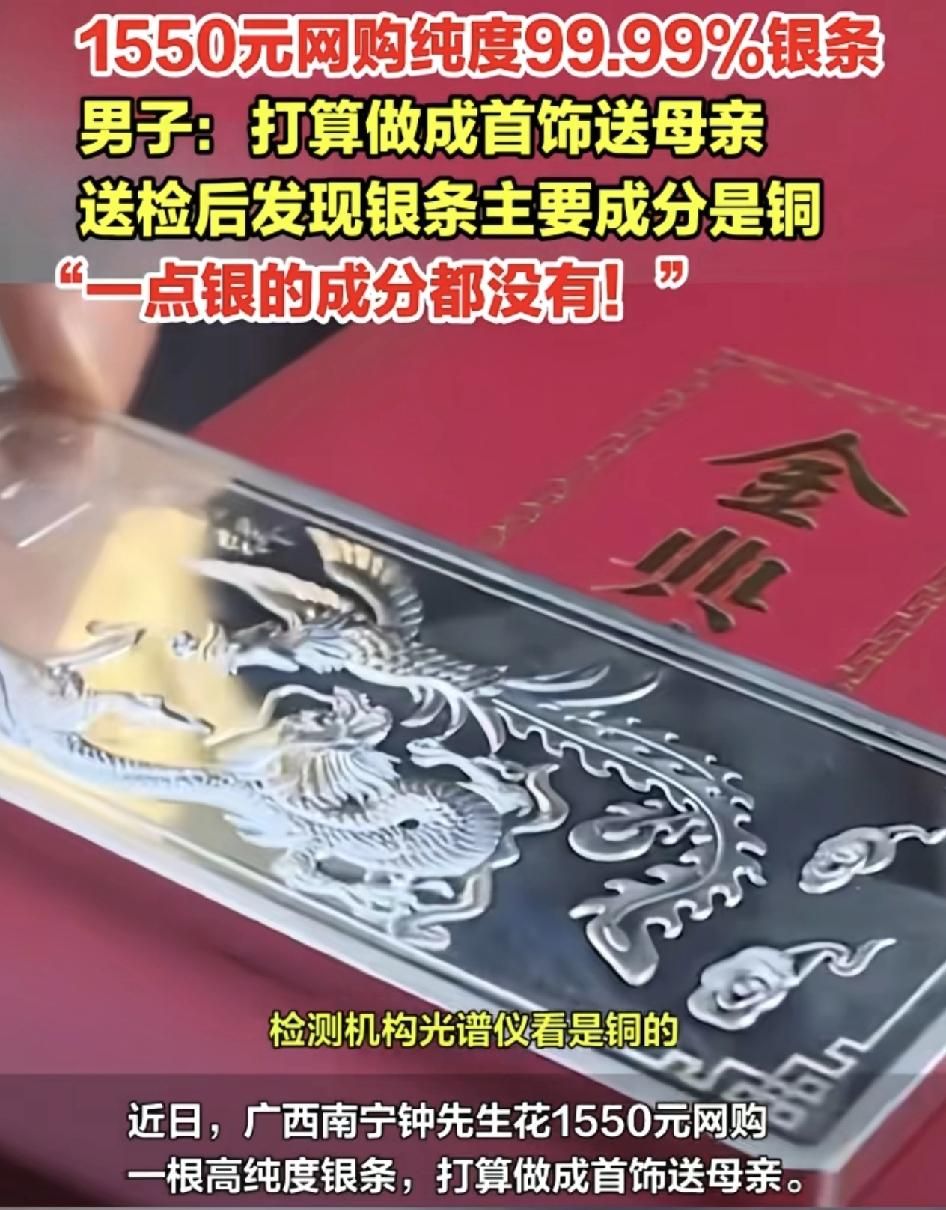 广西南宁一男子在网购平台花了1550元,购买了一条纯度为99.99%的银条,准备做首饰给母亲购买的银条附有检测证书,可自己拿到专门的检测机构,利用光谱仪来检测的时候,发现是一点银的成分都没有,主要成分是铜,还有一点锌。再次向商家反馈的时候,发现店铺已经关闭,只能通过平台处理。