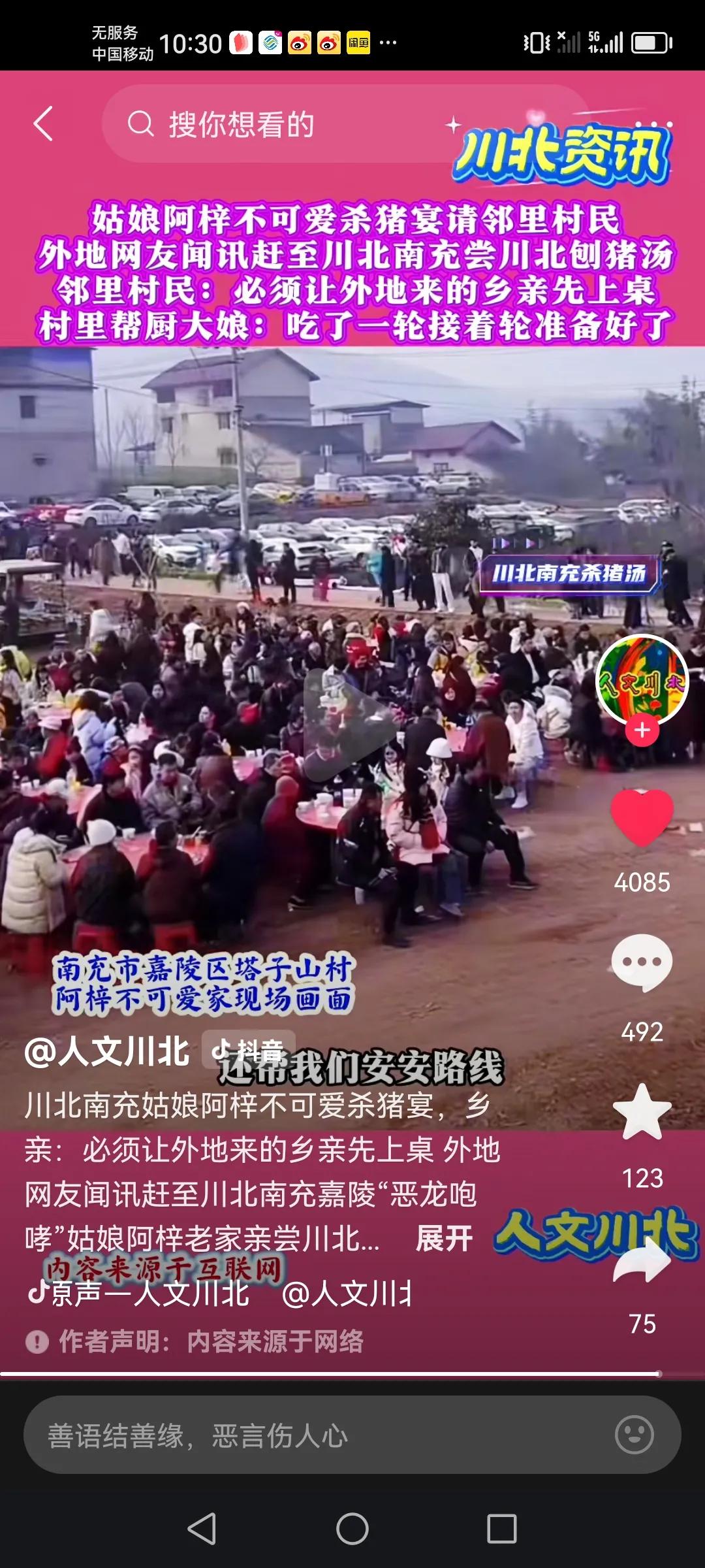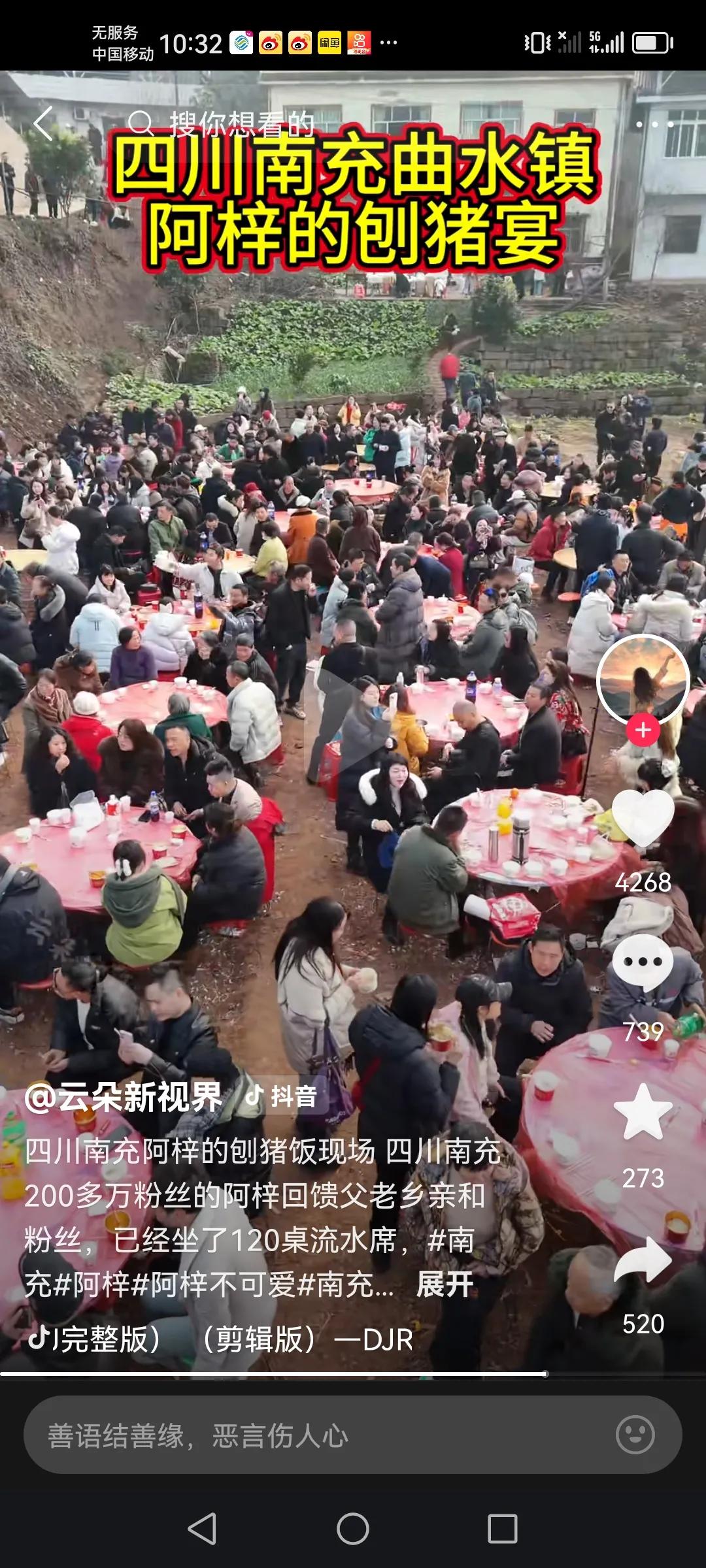 在互联网跳舞5年,在深圳东门“跳恶龙刨笑”的四川南充姑娘阿梓。阿梓不可爱在家乡南充自家村子里举办的杀猪宴是除了合川呆呆最成功的了吧! 人家一两千人有序吃,而且到晚上还有篝火晚会!现场一千多人围着跳舞,阿梓当天直播是全程关了打赏功能,还提前说了,让网友们千万不要刷礼物,而且当地的文旅部门也是大力支持。还从杭州请了维持秩序的有大形活动经验的去帮忙,而且还是免费的去帮忙。 现场主持人也是让外地的先坐上桌,先吃,本地的最后一批吃,村民们也非常理解支持,而且都是去尽力的帮忙。 阿梓姑娘亲自端菜,老爸也在现场招呼大家,维持秩序。现场还有远到的网友们与阿梓合影,阿梓这个活动感觉就是粉丝见面会。真的热闹成功! 以上仅供参考,属个人意见。