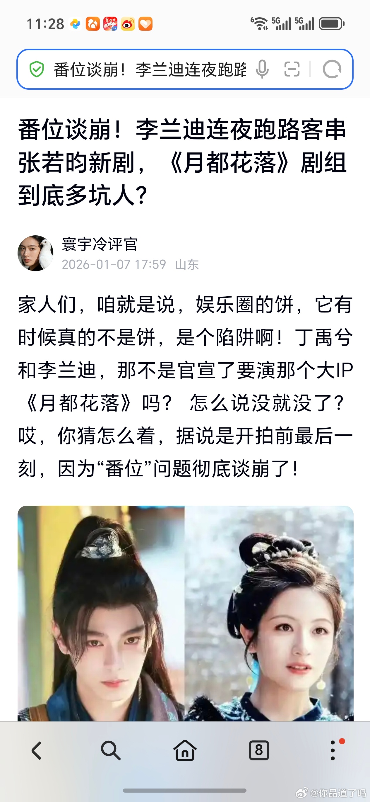 新🍉照这博主讲的《月都花落》里丁禹兮和李兰迪为了争一番吵得不可开交,后来李兰迪直接走了,跑去千里那部剧里演配角。结果月都这边女主没了,整个项目直接黄了,你说逗不逗……