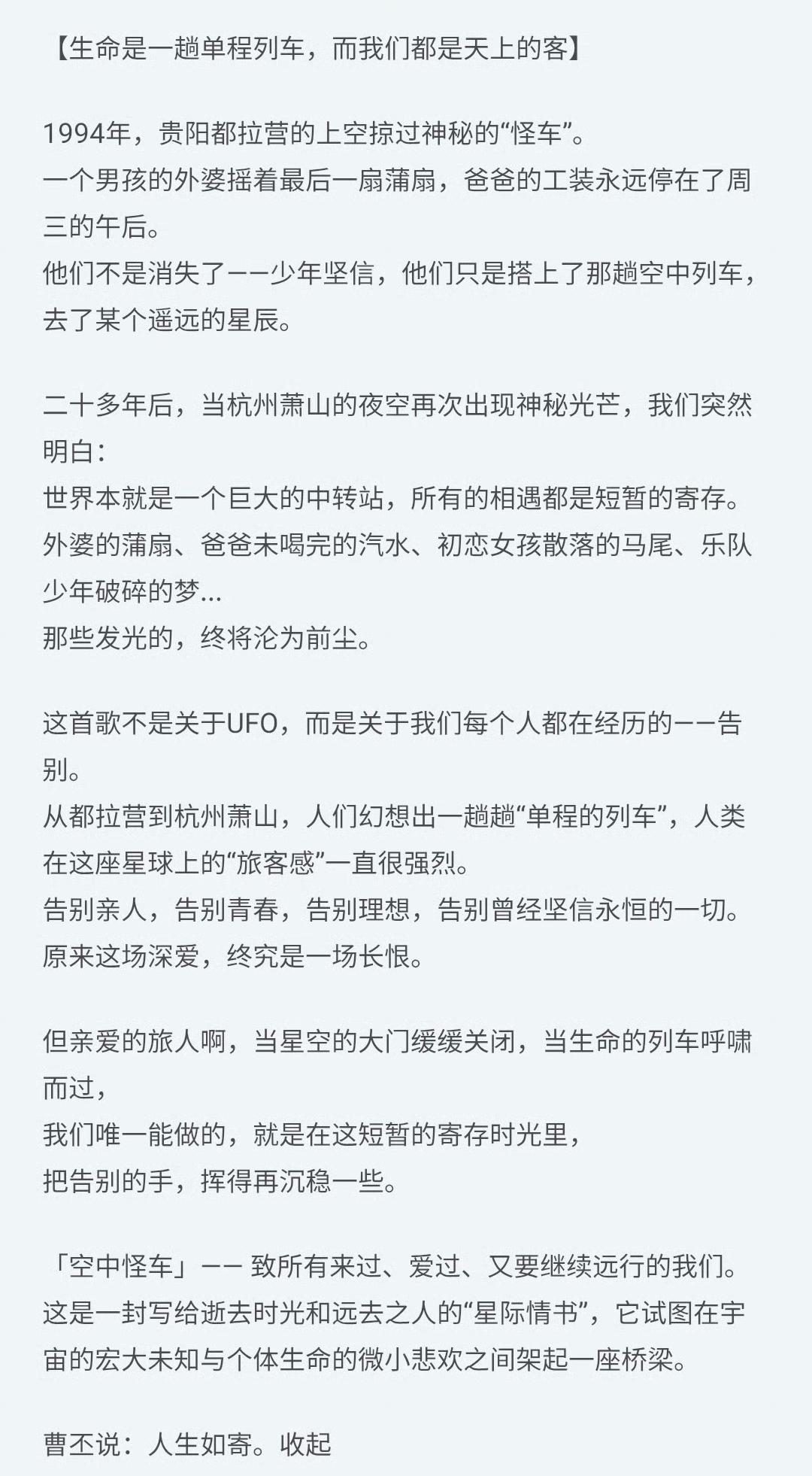 陈楚生新歌《空中怪车事件》背后的故事。 原来这是作曲家张超特邀陈楚生演唱的歌。 据说这首歌的背景除了告别,更有一个很玄幻关于UFO事件有关。 就是1994年发生在贵州“都溪林场事件”。 凌晨伴随天空白光一闪,以及“咣当咣当”像是火车的声音之后,留下一片无法解释的“宽300米、长3公里的林木被齐腰破坏的走廊状”,成为至今未解之谜。而贵州人张超就是凤凰传奇的作词人, 基于这个事件写了这首歌,也刚好点题了趋光号(UFO)降临荒芜之境 ,他写信给楚生,正如他所说这首歌他唱最合适。