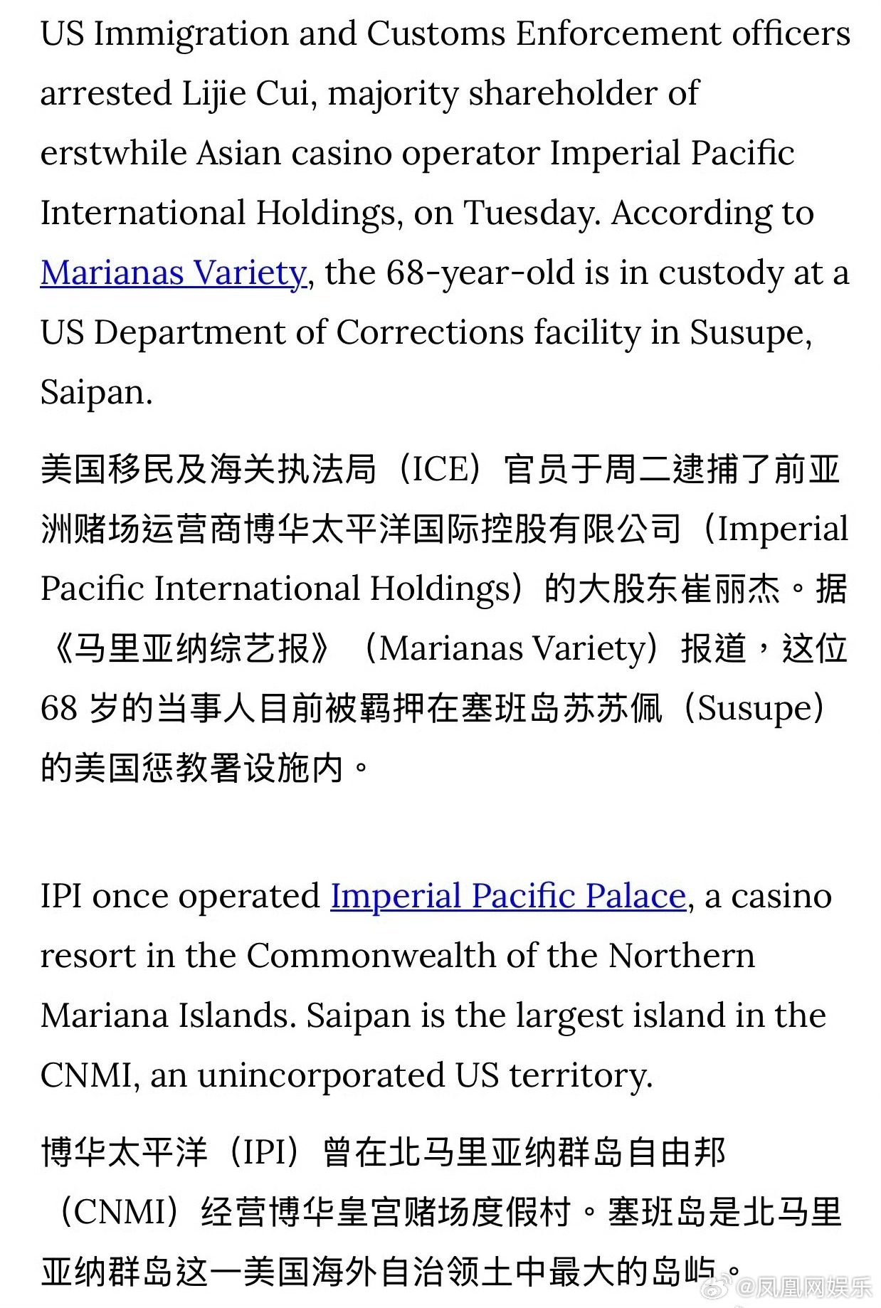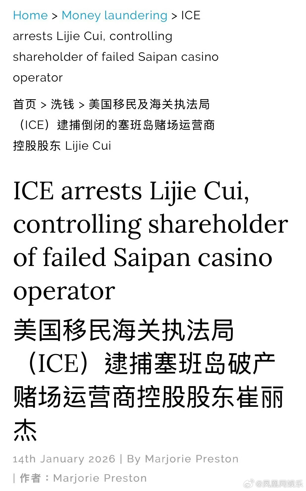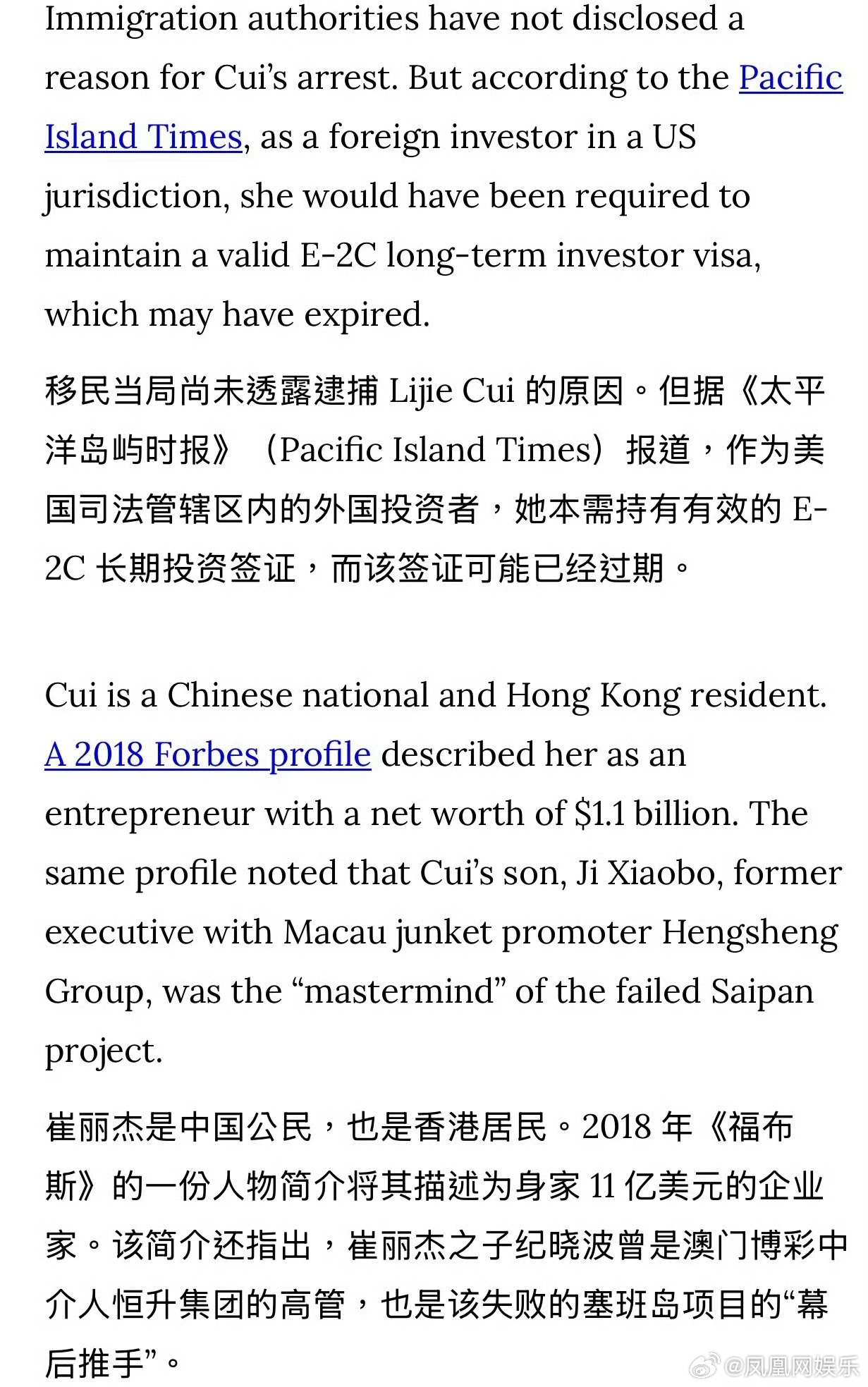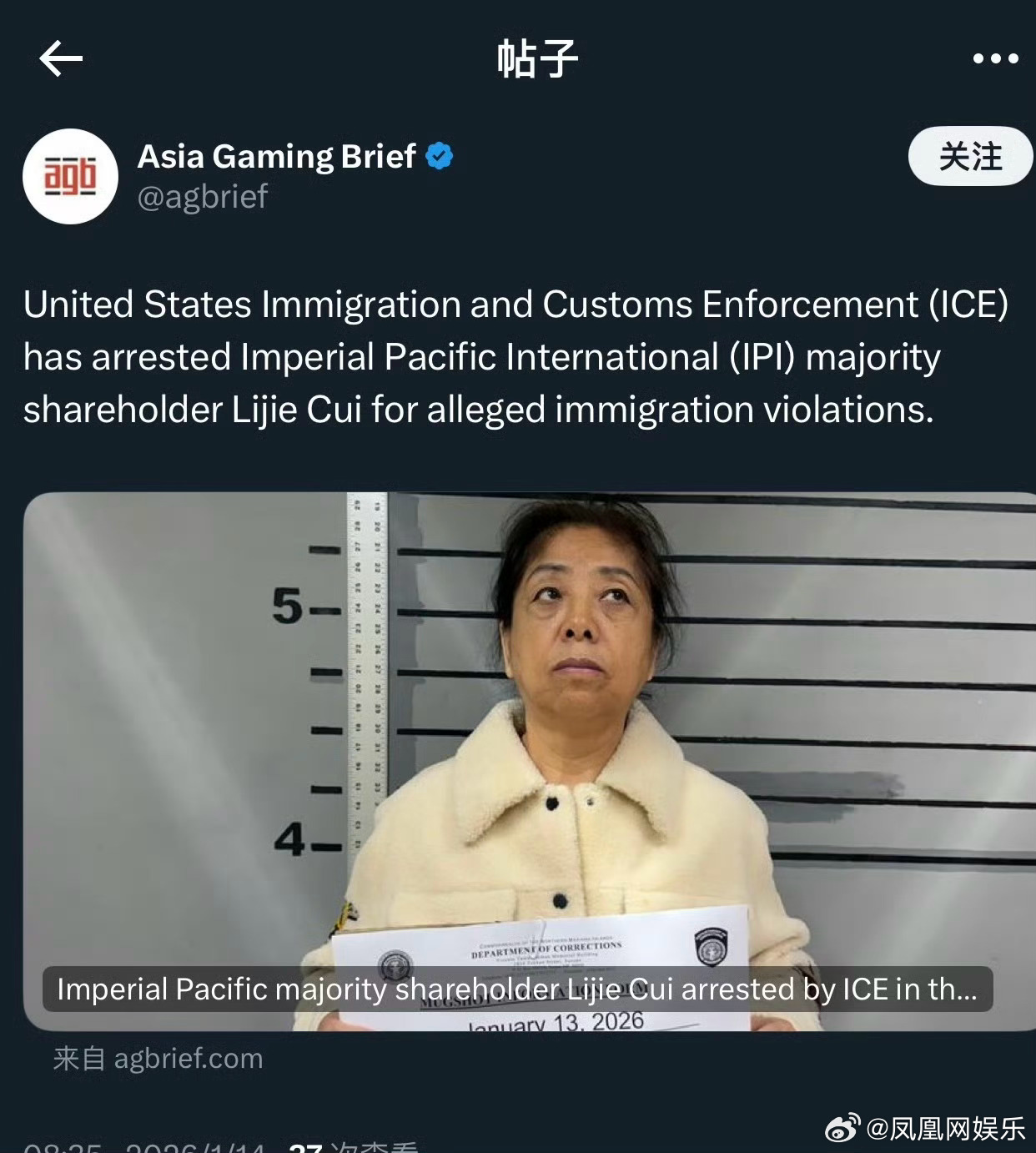 吴佩慈婆婆在美被捕吴佩慈婆婆涉嫌违反美移民法 68岁的崔丽杰(吴佩慈“婆婆”)因涉嫌违反移民法,于当地时间1月13日在塞班岛被美国移民与海关执法局(ICE)逮捕。崔丽杰是纪晓波之母,纪晓波与中国女星吴佩慈育有四名子女。崔丽杰曾是香港博华太平洋国际控股有限公司的大股东,该公司于2014年进驻塞班岛,获独家娱乐场度假开发商牌照。崔丽杰在2015年增持股份至64.37%,成为第一大股东,但该公司目前已破产。崔丽杰与其子纪晓波早年在中国澳门从事博彩中介业务,后转型赌场运营,共同推动塞班岛博华太平洋皇宫赌场及一座价值6亿美元的海滨酒店项目。然而,该赌场长期争议不断:2018年调查揭露其涉嫌非法雇佣持旅游签证的中国公民、违反安全规定及贿赂当地官员。2020年,公司三名高管因非法雇佣外国劳工及转移超2400万美元资金用于资助非法活动被起诉。赌场于2020年3月停业,已于2024年4月申请破产保护。目前崔丽杰被关押在苏苏佩村惩教监狱,ICE尚未公布其被捕具体细节及移民法庭听证日期。