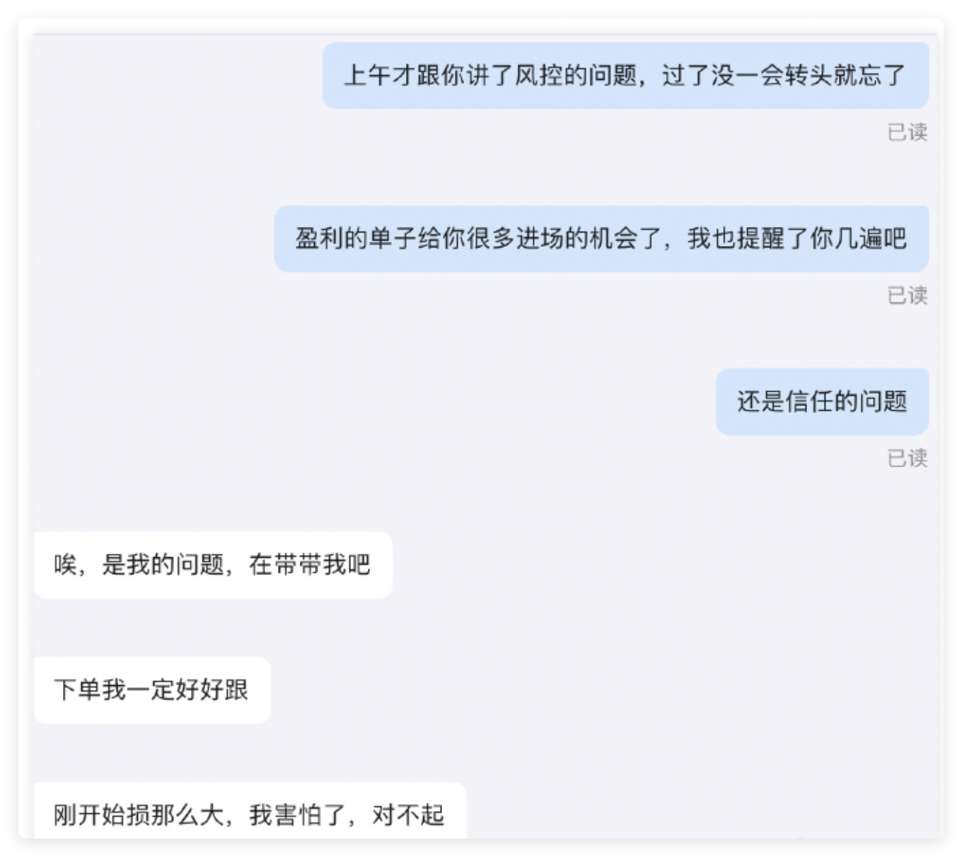 昨天早上刚加入过来的一位新爱好者,因为多单舍不得止损,导致本该在可控范围内的损失放大,85多单又迟迟不敢下手,错过了了本该拿下盈利的单子,挽回损失的机会在眼前白白流失,对于这类爱好者深哥都是做劝退处理。做交易自己一定要弄明白一点,如果对自己够自信,可以选择自己交易,如果自己不具备这个能力找到深哥,一定记得拿出该有的信任!连最基本的信任都没有,我们的合作就是一盘散沙。千万不要做着当前的交易,操着一些无用的嫌心,那样会很累,交易是一件简单、轻松的事。黄金金价金价彻底杀疯了