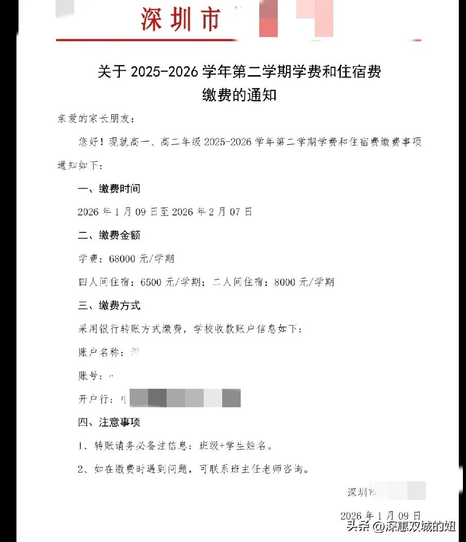 深圳一私立高中学费,有点惊呆。 一学期68000,一学期哦。看到深圳一个私立高中一学期的学费,有点惊呆了,一学期就要这么多钱。 68000一学期,一年就是68000*2,等于68000*2=136000,住宿费有四人间的6500一学期,两人间的8000一学期。 一学期光学费和住宿费起码都是要68000+6500=74500,一年就是74500*2=149000,差不多15W哦,还没有算餐费,生活费。 3年私立高中下来15W*3=45W,我滴天,这个高中我表示上不起,上的起的应该都是家庭条件杠杠的。 而且,了解深圳这个私立高中就在坪山哦,离我们惠州大亚湾也不远,可想而知,深圳市内的私立高中那不是更贵了? 我以前还以为私立高中3W一学期呢?是我想的太简单了吧?谁家孩子能考上公立高中的话,那真是给父母节省了一大笔费用啊。记录我的2026