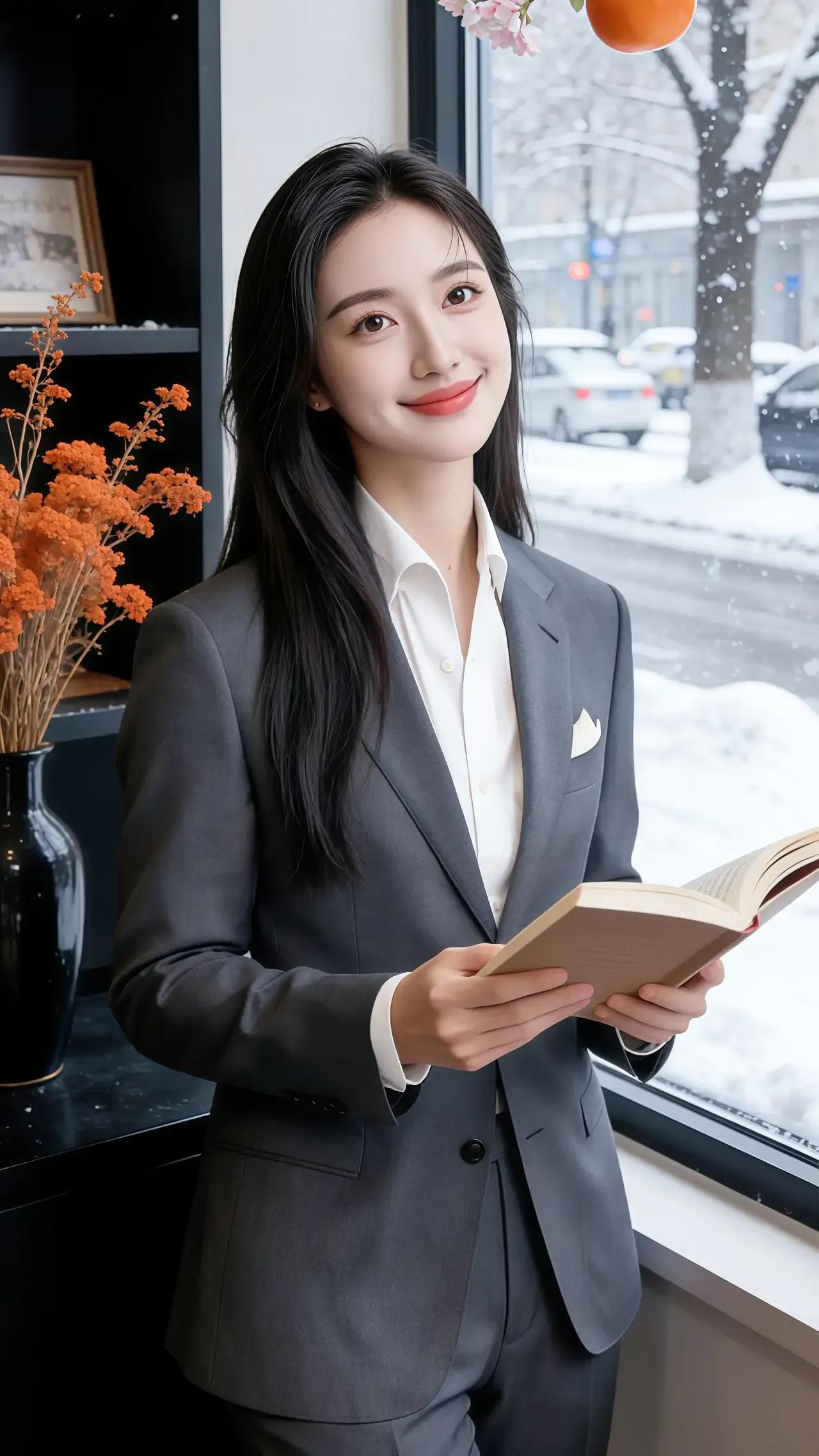 优雅职场女性,手捧书籍,微笑面对生活。