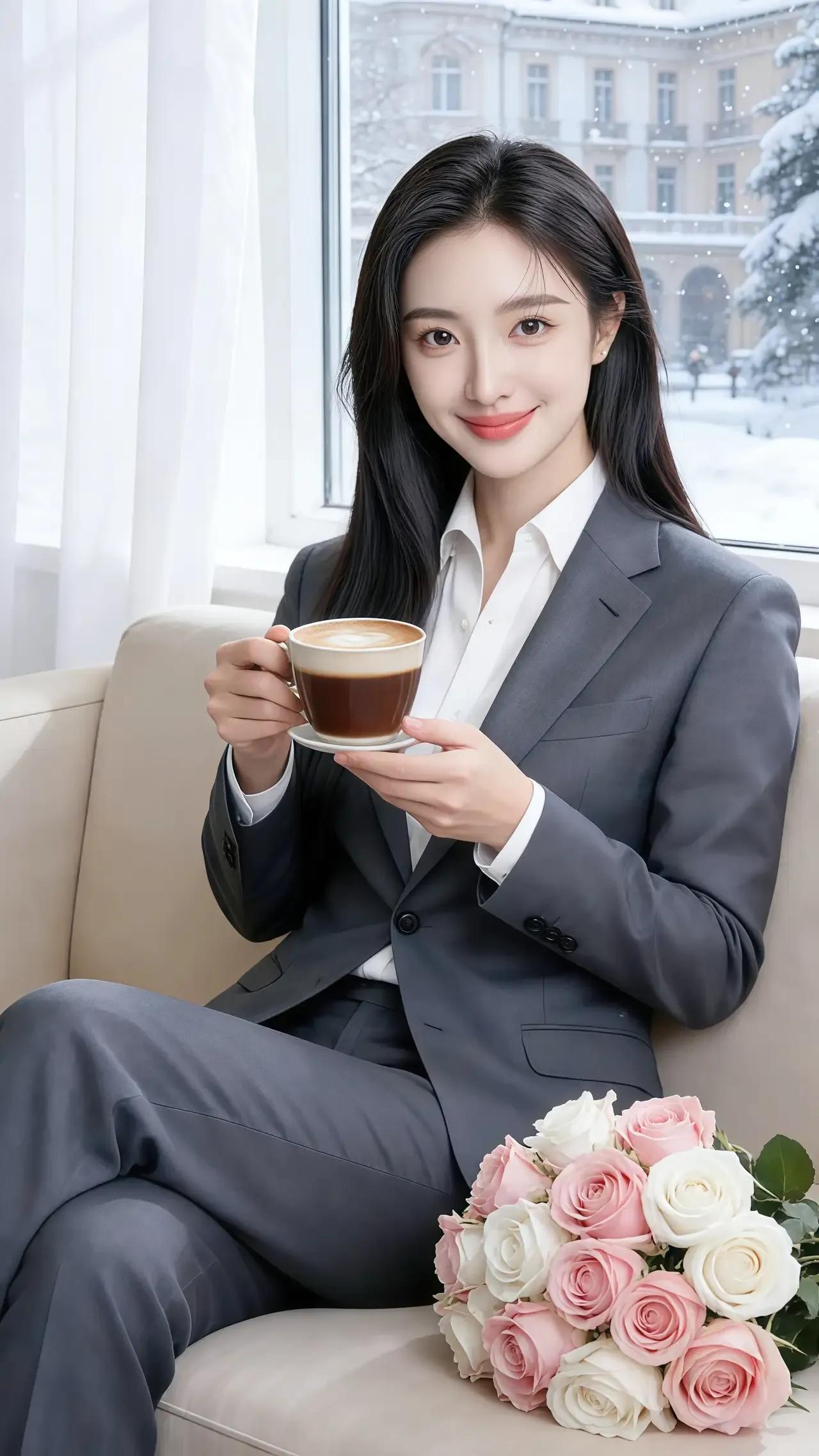 冬日暖阳下,优雅白领品尝咖啡,静享美好时光。