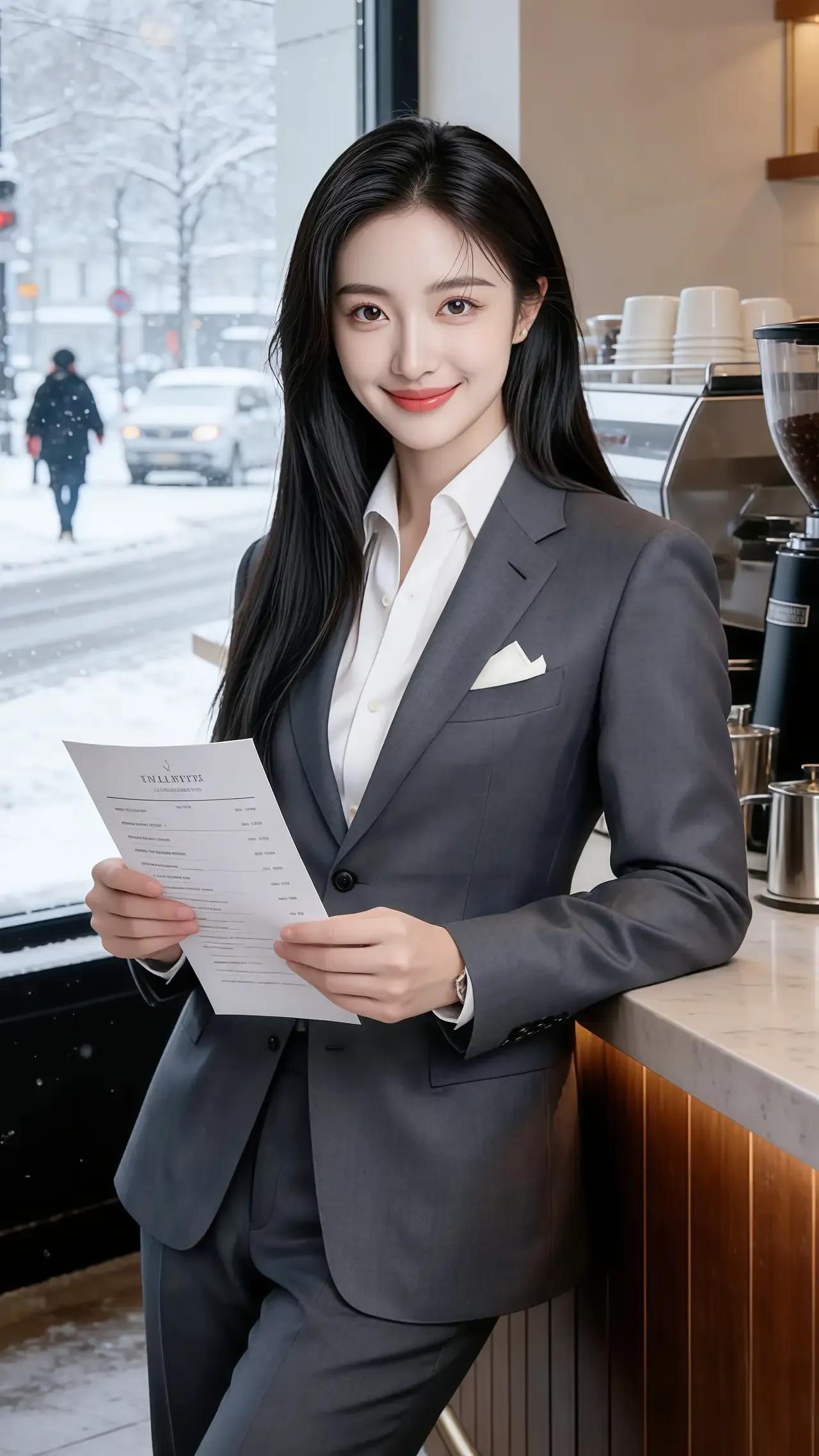 冬日暖阳下的优雅职场女性,手持咖啡,享受宁静时光。