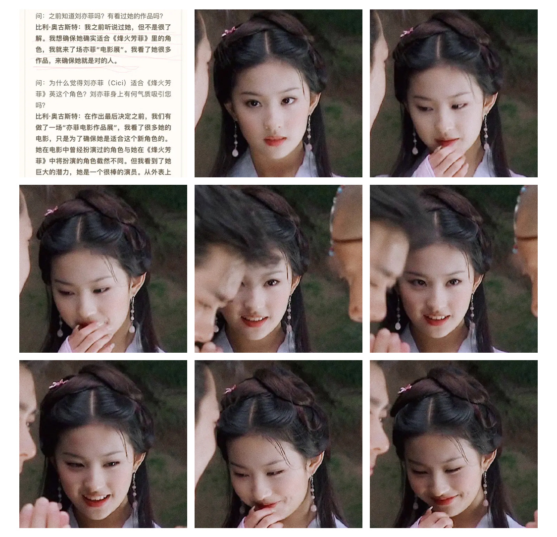刘亦菲参演完金粉世家后接的第二个角色就是王语嫣了,虽然白秀珠出场戏份少,但角色完全立住了也给观众留下了以深刻印象。到后面天龙八部中王语嫣的镜头安排有很明显的对白秀珠风格的借鉴,放大了刘亦菲的优势。包括群戏时候的站位以及跟金粉世家剧中一致的嫣然一笑出场方式,原著中王语嫣见段誉是一惊,而剧版改成跟金粉类似的笑意盈盈,多了几分天真烂漫。不仅镜头感类似,妆容上也有一定重合,这就是很常见的角色红利了。贡献出无数神颜名场面的王语嫣也让刘亦菲一举成名天下知,神仙姐姐这一标签也成为她古装形象的最高肯定之一。时至今日,白秀珠王语嫣的民国大小姐跟武侠第一美人的经典形象仍旧是无数影视剧争相致敬模仿的风格标签。