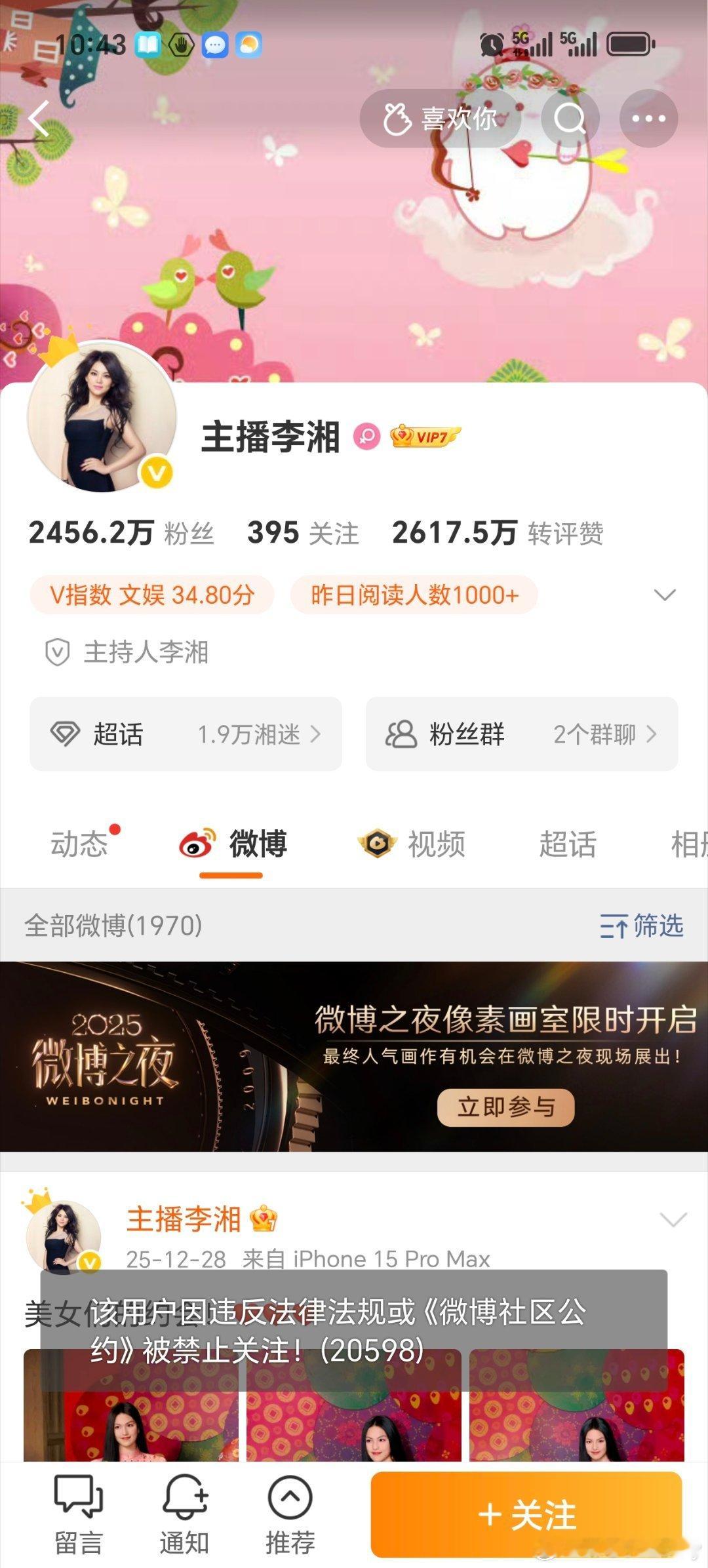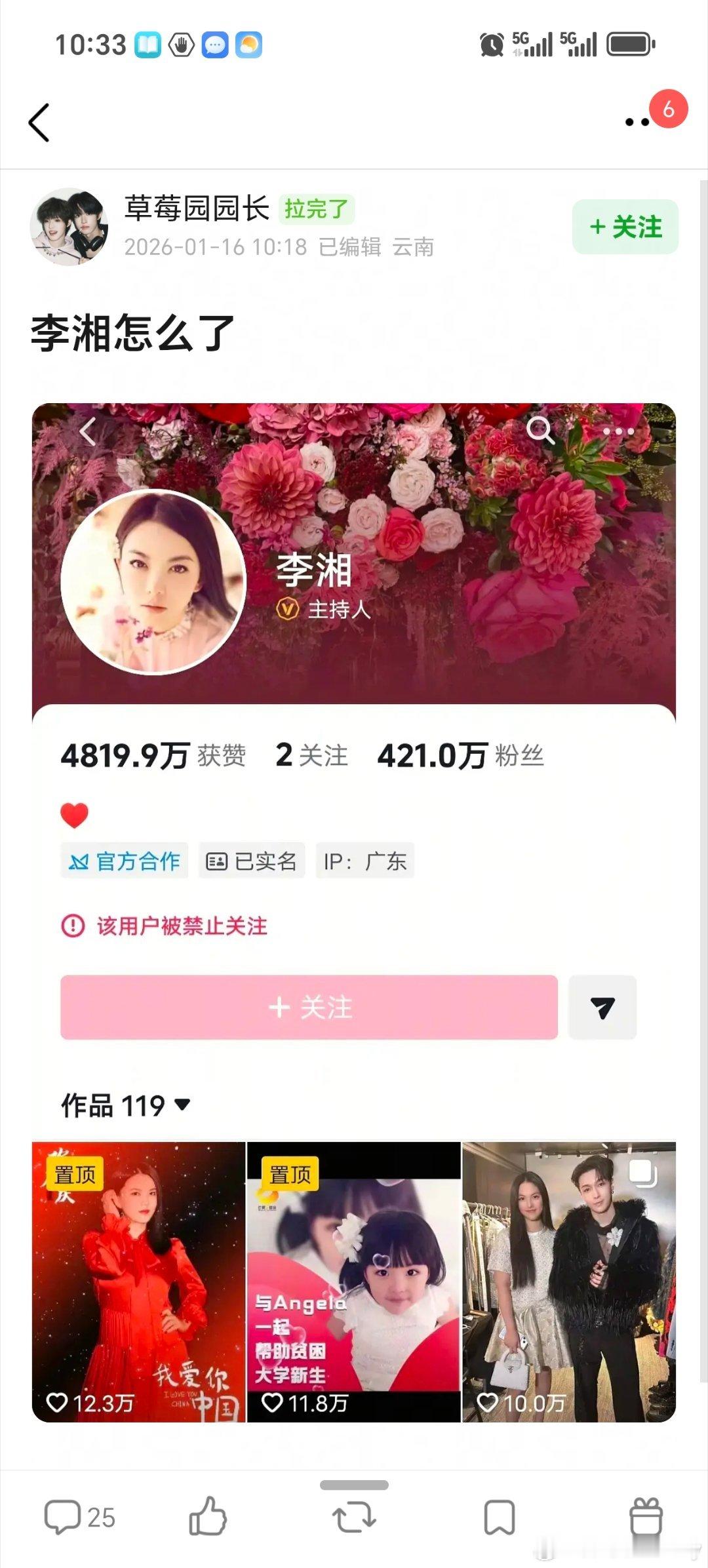 李湘全平台账号被禁止关注李湘全平台被禁止关注?显示因违反法律法规,这是怎么回事?她前段时间不是刚上过综艺吗?