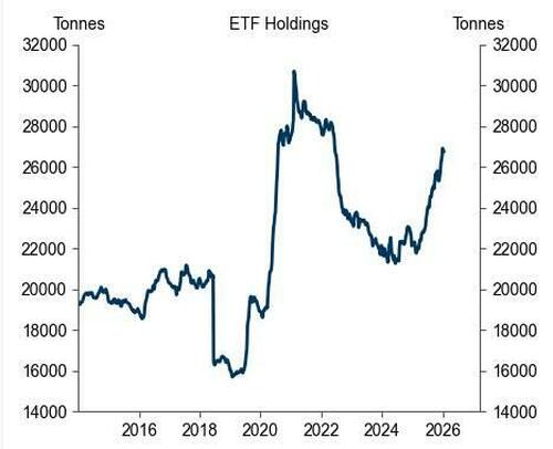 这一趋势仍有增长空间。目前美国非现金金融投资组合中,黄金ETF仅占0.17%——低于2012年的峰值。