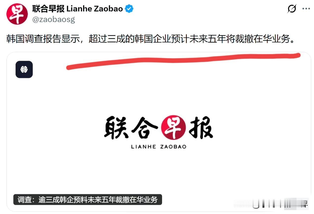 《联合早报》:韩国调查报告显示,超过三成的韩国企业预计未来五年将裁撤在华业务。 这标题起的,不愧是师承西媒,不说韩企在华维持和扩大占多数,只提裁撤占三成。 事实是“未来五年将维持现有规模的韩企占48.6%,与2024年的49.2%基本持平;计划扩大在华业务的韩企比例则由13.8%上升至19.1%。 部分韩企在华经营不善,并不是中国市场恶化导致,其最根本的原因 是这些韩企本身竞争力不够,竞争不过中国本土企业。最明显的比如显示面板、手机与家电,这个行业在二十多年前是日韩的强项,但随着中国本土企业的强势崛起,日韩在这方面可以说是全面溃退,日本这个行业在中国市场基本可以说为零了。韩国这方面也差不多。 之所以会发展成今天这个境地,韩国自身有很大的原因,一是技术没有大的进展,二是服务态度极差,对中国客户和欧美客户是区别对待。 最典型的就是三星手机,原本他是中国销售量最大的品牌手机,结果因为带有歧视性的售后服务,三星手机现在在中国市场占有率可以忽略不计。 说到底,这些韩企之所以选择退出,是因为竞争不过中国本土企业,这才是最大的原因。中韩产业关系 韩企 韩国企业动态 韩企撤离
