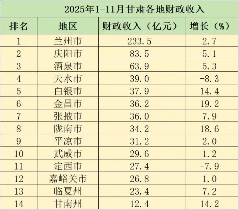 甘肃各市1-11月地方财政收入出炉:兰州超200亿、白银有望赶超天水、武威超定西 甘肃省1-11月地方财政收入完成1000.2亿,同比增长5.5%,这也是甘肃省地方财政收入首次在前十一个月突破一千亿大关,从甘肃各市1-11月地方财政收入来看,天水和定西较去年同期为负增长,其余各市都实现了不同幅度的增长。 省会兰州1-11月地方财政收入超过二百亿,完成233.5亿,同比增长2.7%,稳居全省榜首。 天水和白银1-11月地方财政收入分别完成39亿和37.9亿,同比增长-8.3%和14.4%,白银财政增速与增量远远高于天水市,与天水的差距缩小至1.1亿,且有望全年赶超天水。 武威和定西1-11月地方财政收入分别完成29.6亿和27.4亿,同比增长1.2%和-7.9%,定西财政增量与增速都低于武威,导致地方财政收入被武威反超2.2亿。