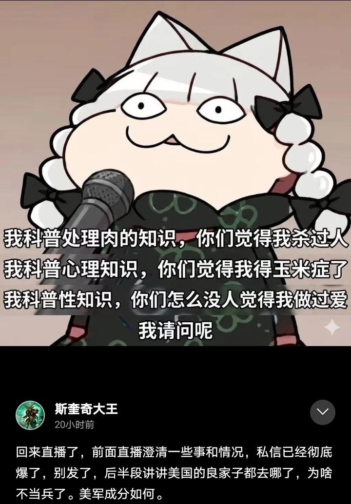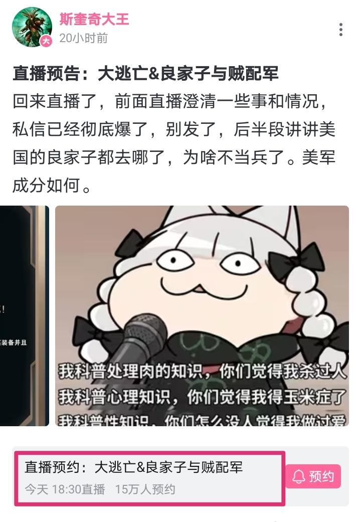 哇,直播预约人数已经超15万了!今晚18:30在小破站开播,这是“牢A”斯奎奇大王回国后首播,有很多人好奇牢A这次会不会露脸直播呢? 我觉得应该不太可能,虽说现在已经回到国内,安全问题不用担心了,但是他预告的直播内容跟这次“胜利大逃亡”有关,还有就是“美军成分如何”。这些话题很抓人眼球,同时也是比较敏感的,所以他这次大概率仍不会露脸直播。 可能很多网友也和我一样,对这个零零后的年轻人很好奇,尤其是他这几天都经历了什么,所以非常期待他今晚的直播,难怪有这么多人预约。 不过话说回来,对于一个年仅20来岁的年轻学生,联合国五常已经有四常的顶级报刊引用或报道他的言论,这份殊荣足以自傲了! 个人认为,作为一个为我这个社会主义巨婴解锁“灵视”技能权限的人,牢A完全配得上这波泼天流量!