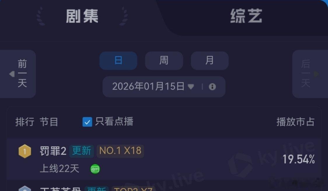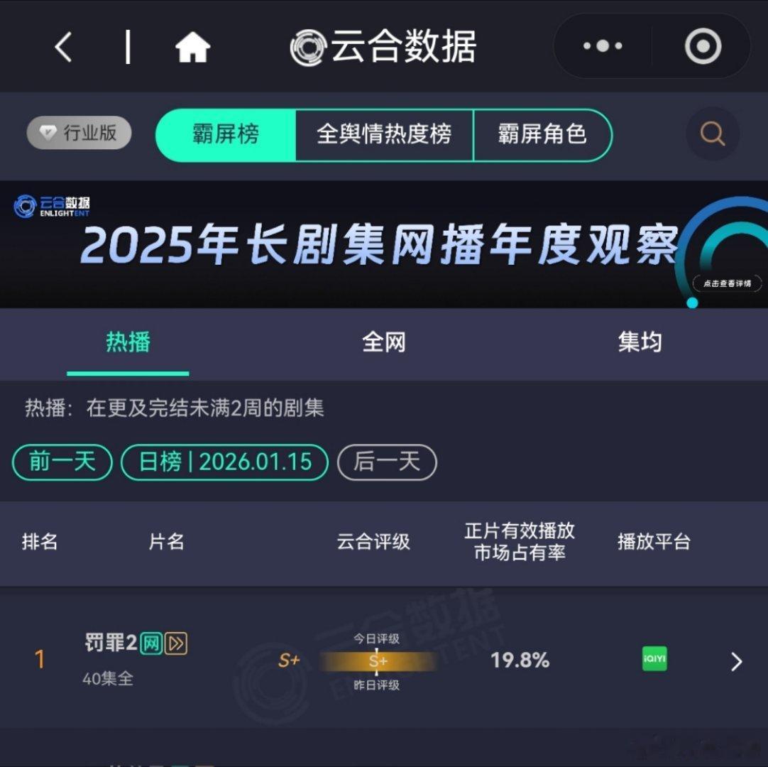 1月15日,罚罪2恢复更新第2天罚罪2云合第一占比继续逆跌!罚罪2酷云点播第一罚罪2灯塔第一逆跌!罚罪,云合第11,《冬至》云合网剧第24,破冰行动云合网剧第25,《冬至》酷云收视率卫视第2(新高)。今天更新39集,还有2天完结! 黄景瑜秦枫黄景瑜罚罪2