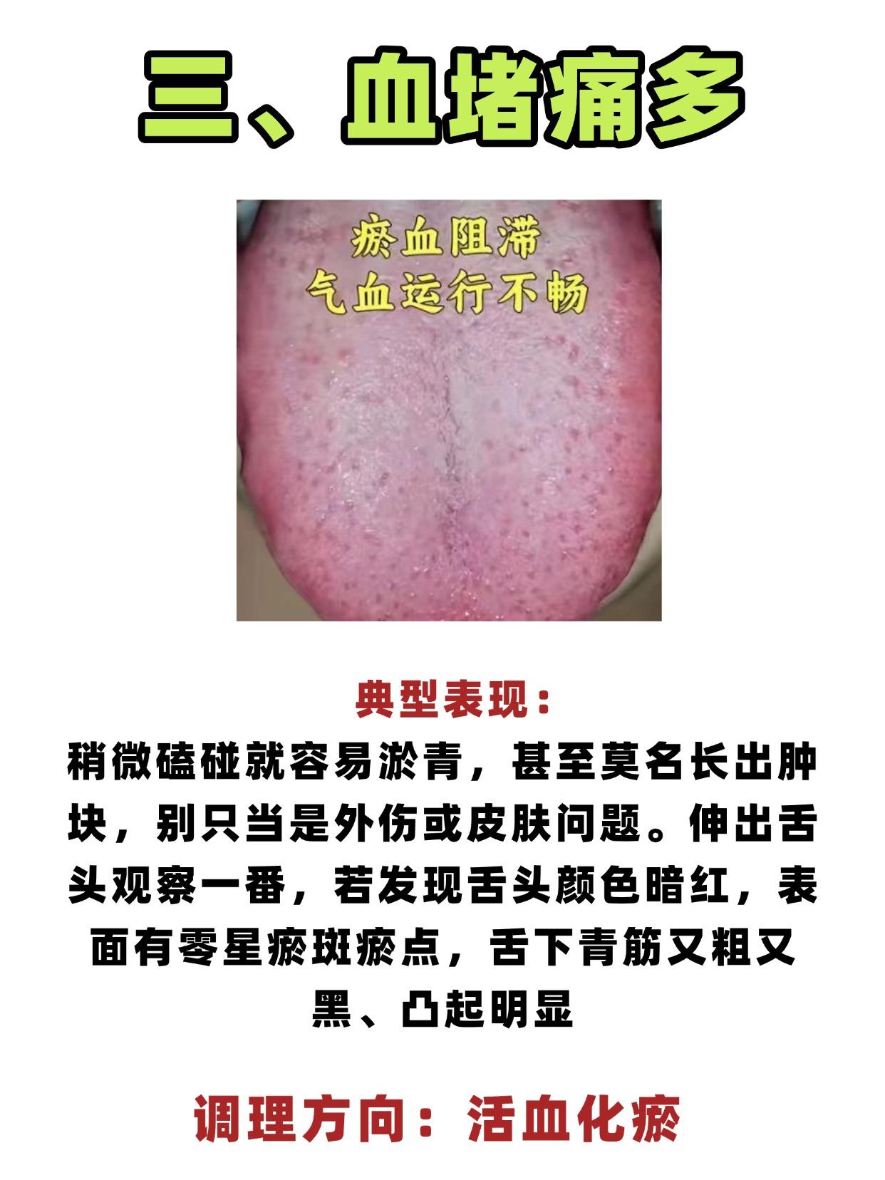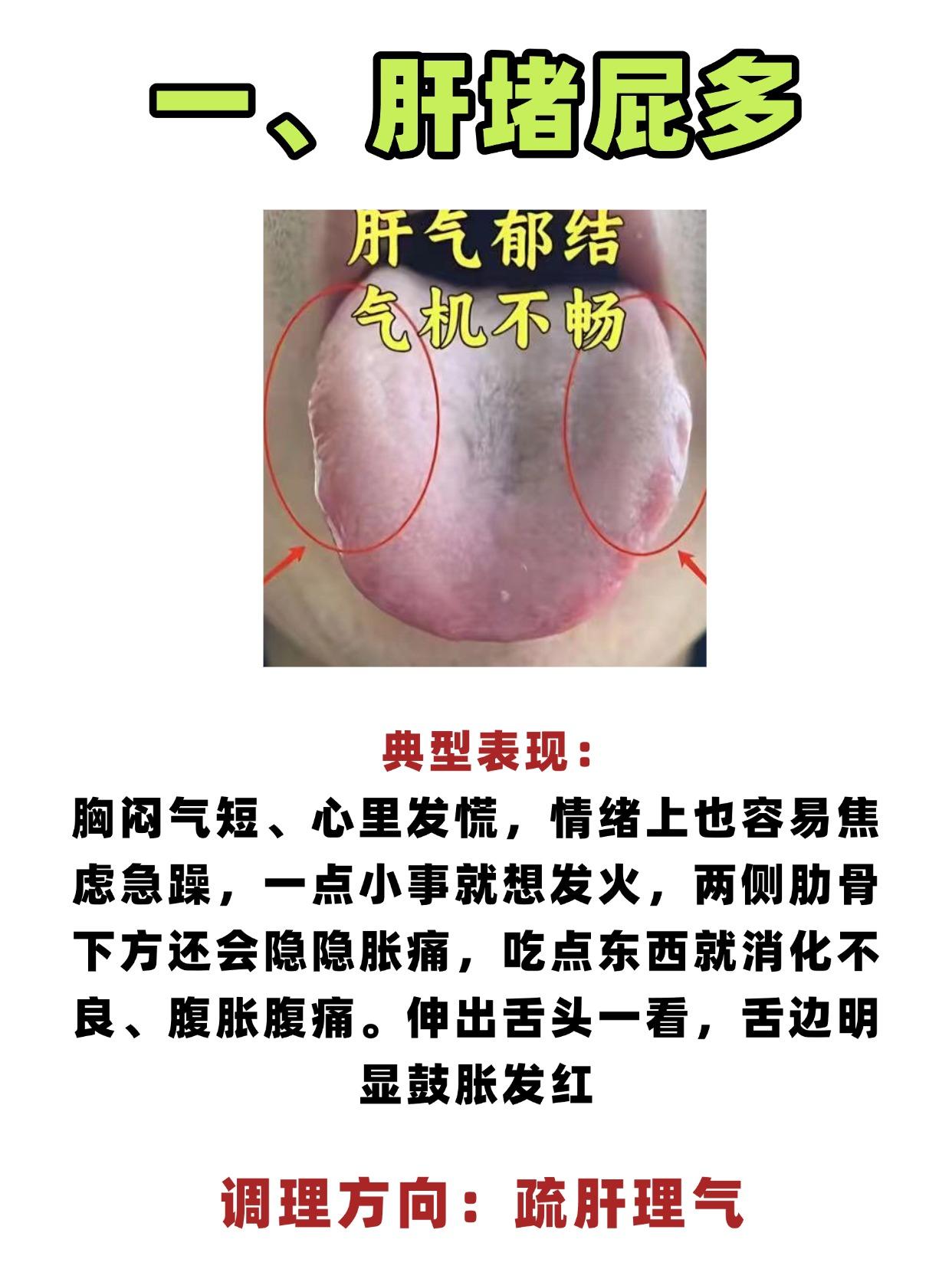 肝堵、脾堵、血堵?本质是气血不通,百病丛生! 一、肝堵屁多 典型表现:胸闷气短、心里发慌,情绪上也容易焦虑急躁,一点小事就想发火,两侧肋骨下方还会隐隐胀痛,吃点东西就消化不良、腹胀腹痛。伸出舌头一看,舌边明显鼓胀发红 调理方向:疏肝理气 二、脾堵痰多 典型表现:总觉得嗓子里黏着痰,咳不净也咽不下,疲倦乏力、懒得动弹,脑袋昏沉像裹了层雾,四肢沉重发困,大便也不成形,冲马桶冲不干净。伸舌头一看,舌中凹陷、甚至有裂纹,舌苔白厚腻 调理方向:健脾化痰 三、血堵痛多 典型表现:稍微磕碰就容易淤青,甚至莫名长出肿块,别只当是外伤或皮肤问题。伸出舌头观察一番,若发现舌头颜色暗红,表面有零星瘀斑瘀点,舌下青筋又粗又黑、凸起明显 调理方向:活血化瘀