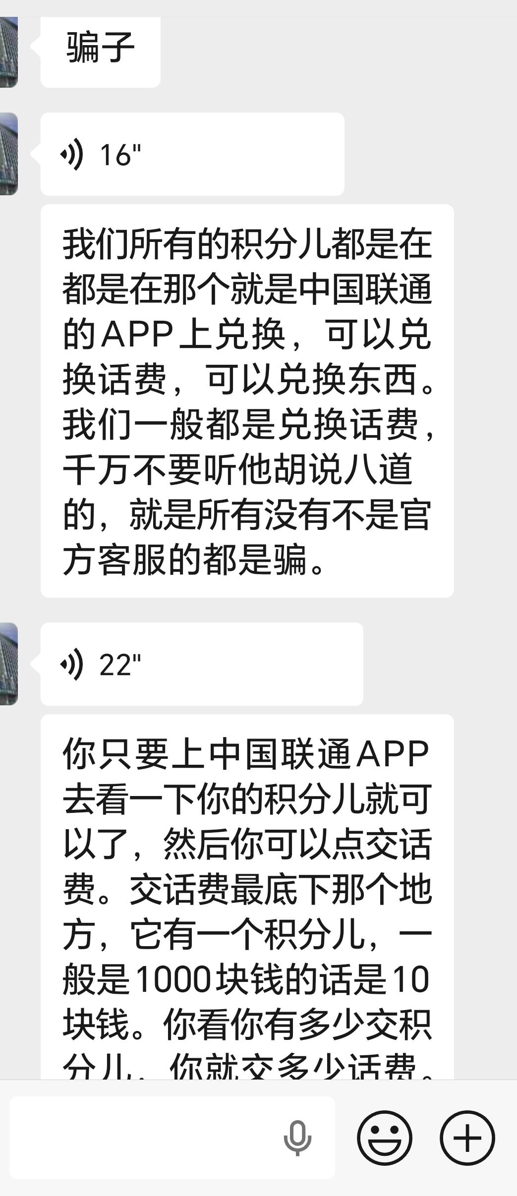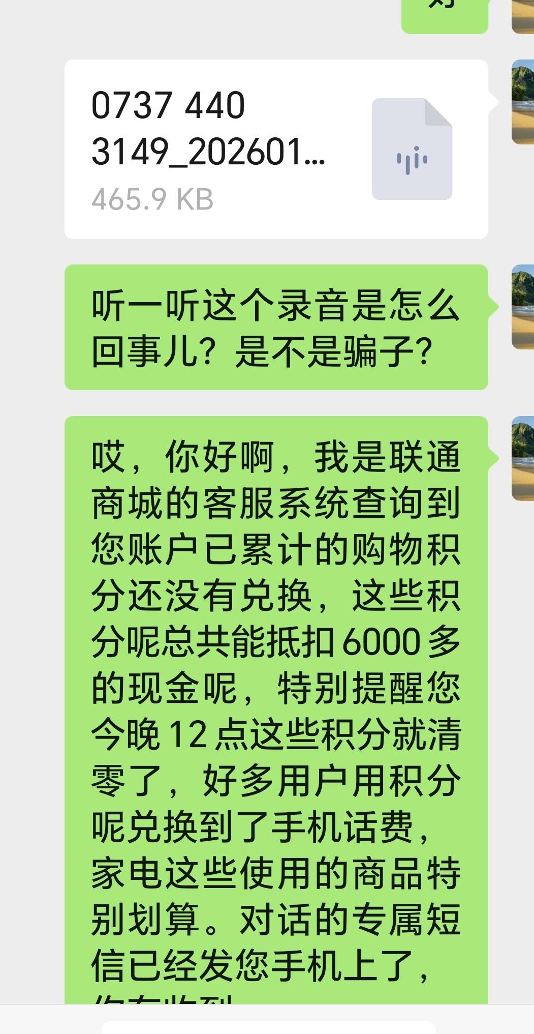 接了一个湖南益阳的骗子电话0737 4403149听听骗子怎么说: 你好啊,我是联通商城的客服系统查询到您账户已累计的购物积分还没有兑换,这些积分呢总共能抵扣6000多的现金呢,特别提醒您今晚12点这些积分就清零了,好多用户用积分呢兑换到了手机话费,家电这些使用的商品特别划算。对话的专属短信已经发您手机上了,你有收到。 我知道积分能兑换流量什么的,但是不确定,先咨询了一下联通的经理: 我们所有的积分儿都是在都是在那个就是中国联通的APP上兑换,可以兑换话费,我们一般都是兑换话费,千万不要听他胡说八道的,就是所有没有不是官方客服的都是骗。 联通公司的业务员哪有时间打电话给你,告诉你兑换家电,手机什么的呀,如果按照他说的,我发财了,我的积分能兑换6000多元,我一年的话费打着滚使用也用不完,那联通赔死了。 而且这个电话号码是湖南的,我是山东的,湖南的联通和山东的联通都合并了吗?发的链接我没敢打开。 到了年底了,骗子使着混成解数,都在骗钱,什么剧本都有,一会你的医保卡,一会又来联通积分了,还有什么剧本?