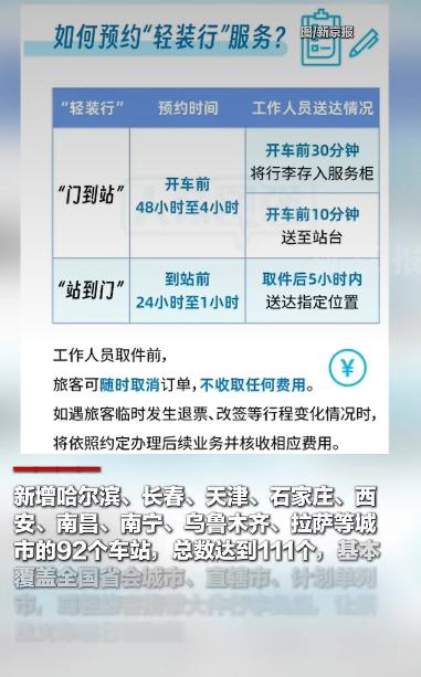 “坐高铁可以不用自己扛行李了”。这个话题一出来,评论区瞬间炸开了锅,有人说“终于解放双手了”,也有人调侃“以后高铁站是不是要配搬运机器人了”。其实啊,这背后是中铁快运悄悄上线的一项新服务,名字叫“轻装行”,专门帮旅客解决行李搬运的难题。 先说说这项服务是怎么来的。以前坐高铁,最头疼的就是大包小包的行李。尤其是春运或者节假日,车站里人挤人,拖着行李箱在站台上狂奔的场景,简直成了“年度大片”。更别提那些带孩子的家长、行动不便的老人,或者行李特别多的商务人士,光是搬运行李就能累出一身汗。中铁快运大概就是看准了这个痛点,去年夏天先在部分城市试点,结果反响特别好,今年就直接把服务范围扩大到了全国111个车站,基本覆盖了省会城市和主要交通枢纽。 那“轻装行”到底怎么用呢?其实特别简单。如果你已经买了高铁票,打开手机上的铁路12306APP或者中铁快运的小程序,就能看到“轻装行”的预约入口。服务分两种:一种是“门到站”,比如你住在北京朝阳区,要坐高铁去上海,可以提前预约,工作人员会到你家门口把行李取走,直接送到车站的安检口,甚至能帮你把行李搬到站台上的行李架;另一种是“站到门”,比如你从上海虹桥站下车,行李太多拿不动,可以预约让工作人员把行李送到你指定的地址,比如酒店或者家里。两种服务都支持同城35公里内的配送,基本能覆盖大部分城区。 价格方面,中铁快运采用的是按件计费。如果是“门到站”或者“站到门”,每件行李68元;如果需要直接送到站台或者从站台取走,每件98元。这个价格听起来不算便宜,但想想看,如果你自己打车去车站,再雇个人搬行李,费用可能更高,而且还得折腾。尤其是对于商务座旅客,在北京、上海、广州等6个车站,行李可以直接送到商务候车厅,服务费也是98元一件,算是给高端旅客的额外福利。 当然,这项服务也不是随便什么行李都能搬。根据规定,每名普通旅客最多能带20公斤行李,儿童是10公斤,外交人员35公斤。行李的尺寸也有要求,动车组列车不能超过130厘米,普速列车不能超过160厘米。另外,像易燃易爆物品、管制刀具这些危险品,肯定是不能托运的。 自从“轻装行”服务上线后,网友们的评价挺两极分化。有人觉得特别实用,尤其是带孩子的家长和老人,再也不用为行李发愁了;也有人觉得价格有点高,希望未来能推出更便宜的套餐,比如按重量计费或者针对学生、老人的优惠。不过不管怎么说,这项服务的出现,至少说明铁路部门在想办法提升旅客的出行体验,毕竟“轻装上阵”才是现代出行的正确打开方式嘛。 来源:新京报