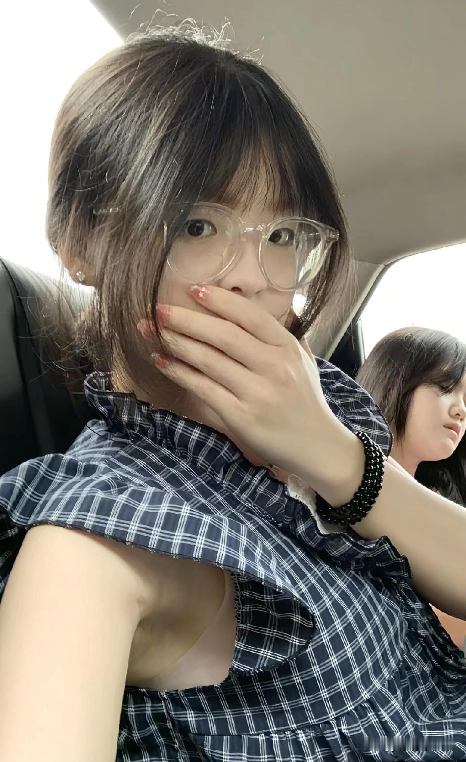 元气少女车内自拍,清新眼镜与格子裙搭配,元气满满!
