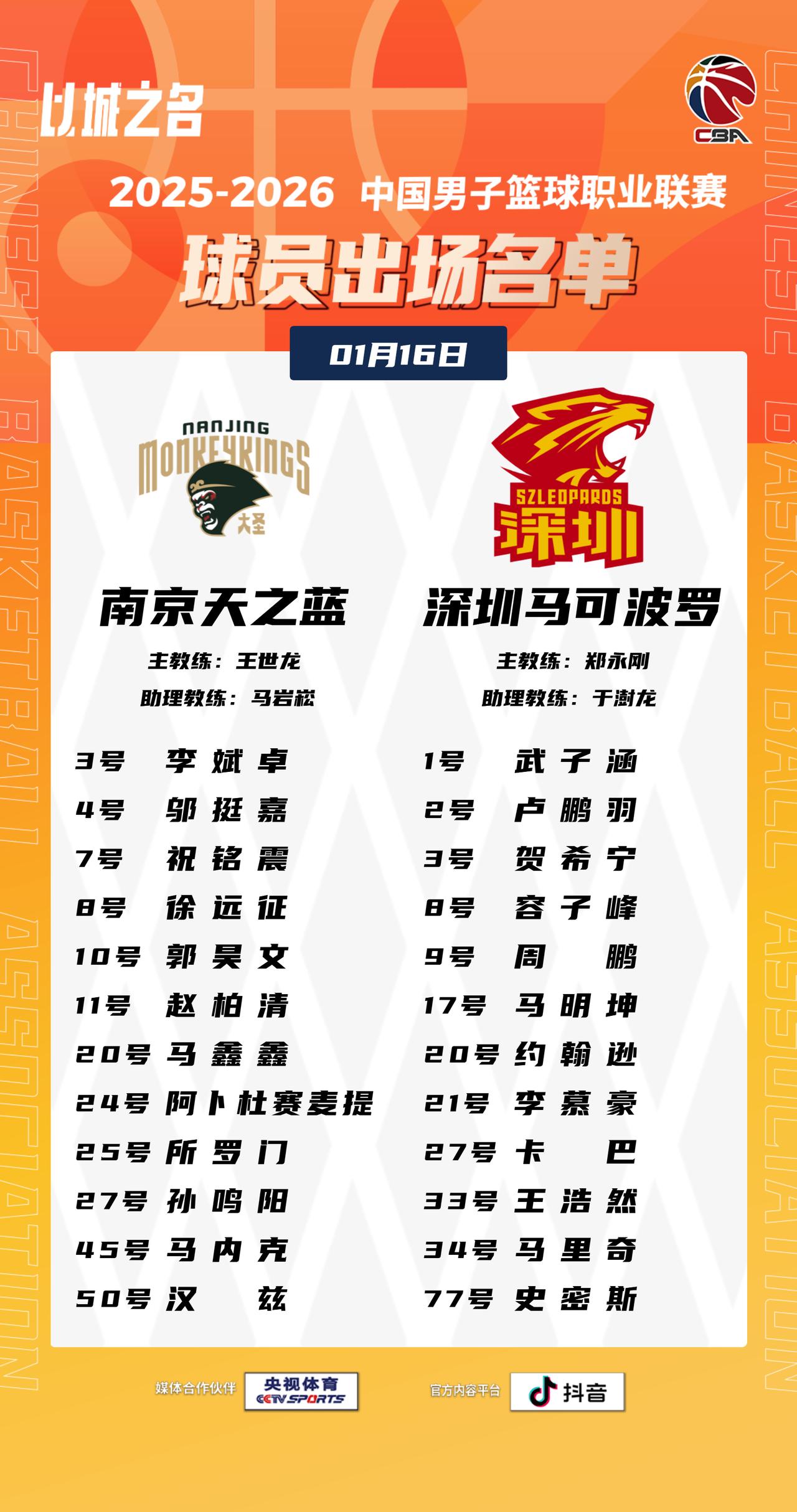 【大名单出炉】2025-2026赛季CBA联赛常规赛第十六轮今晚继续进行,5场比