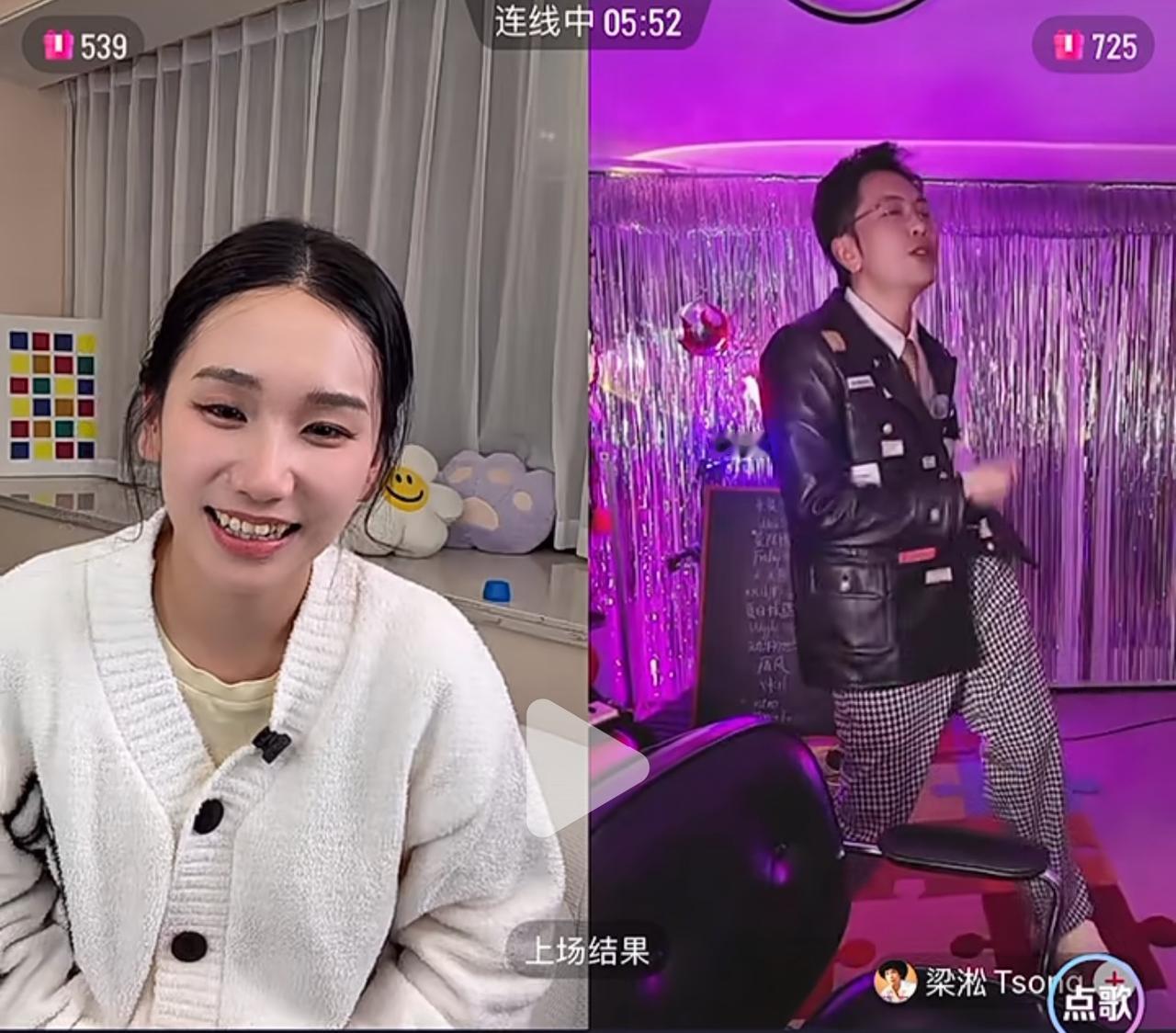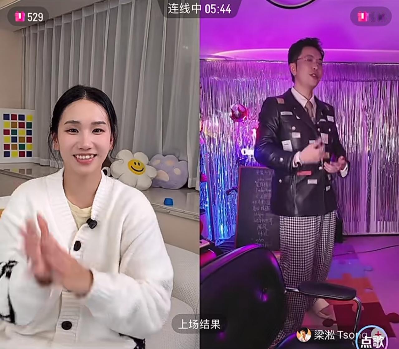 梁淞在直播中向何美延唱跳《征服》! 果然这对rap夫妇是懂这波流量的。 俩人不仅