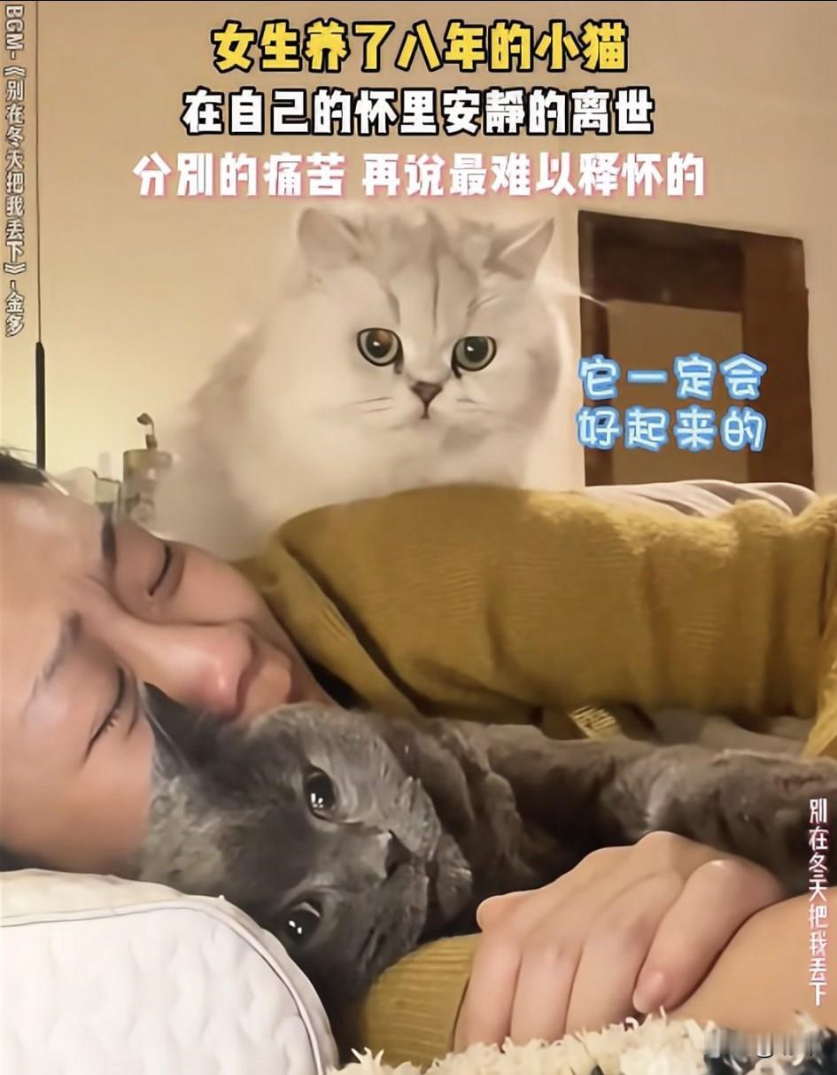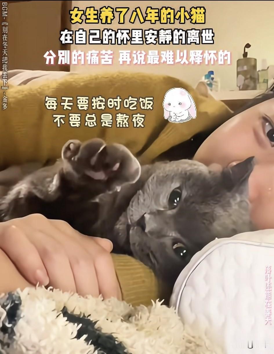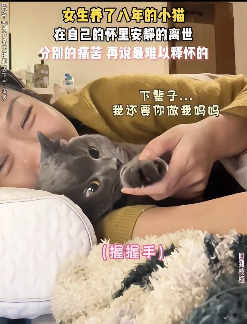 泪目了!一位小姐姐养了两只猫咪,其中一只灰色的蓝猫她养了八年,可最近它的状态越来越差,心急的小姐姐把它带去宠物检查治疗,可遗憾的是医生说它已经病入膏肓无法治疗了。 小姐姐只好难过的把它带回家去,虽然小姐姐很认真的照顾它,可它还是很快进入了弥留之际,小姐姐把它抱在怀里,一直痛哭流涕,另一只小猫也蹲在旁边焦急的望着它,虽然小猫已经无法发出声音,它却用出最后的力气努力的抬起前爪和主人握握手,这也是他们的最后一次握手了!这也是它在安慰主人别难过了!最终蓝猫在小姐姐怀里安静的离世,这种永别的痛苦,真的太过难过!