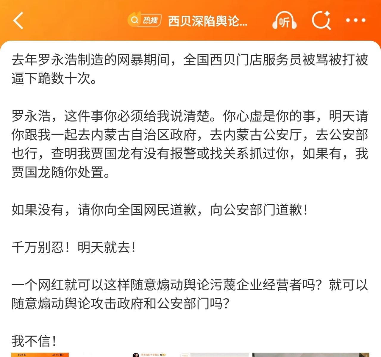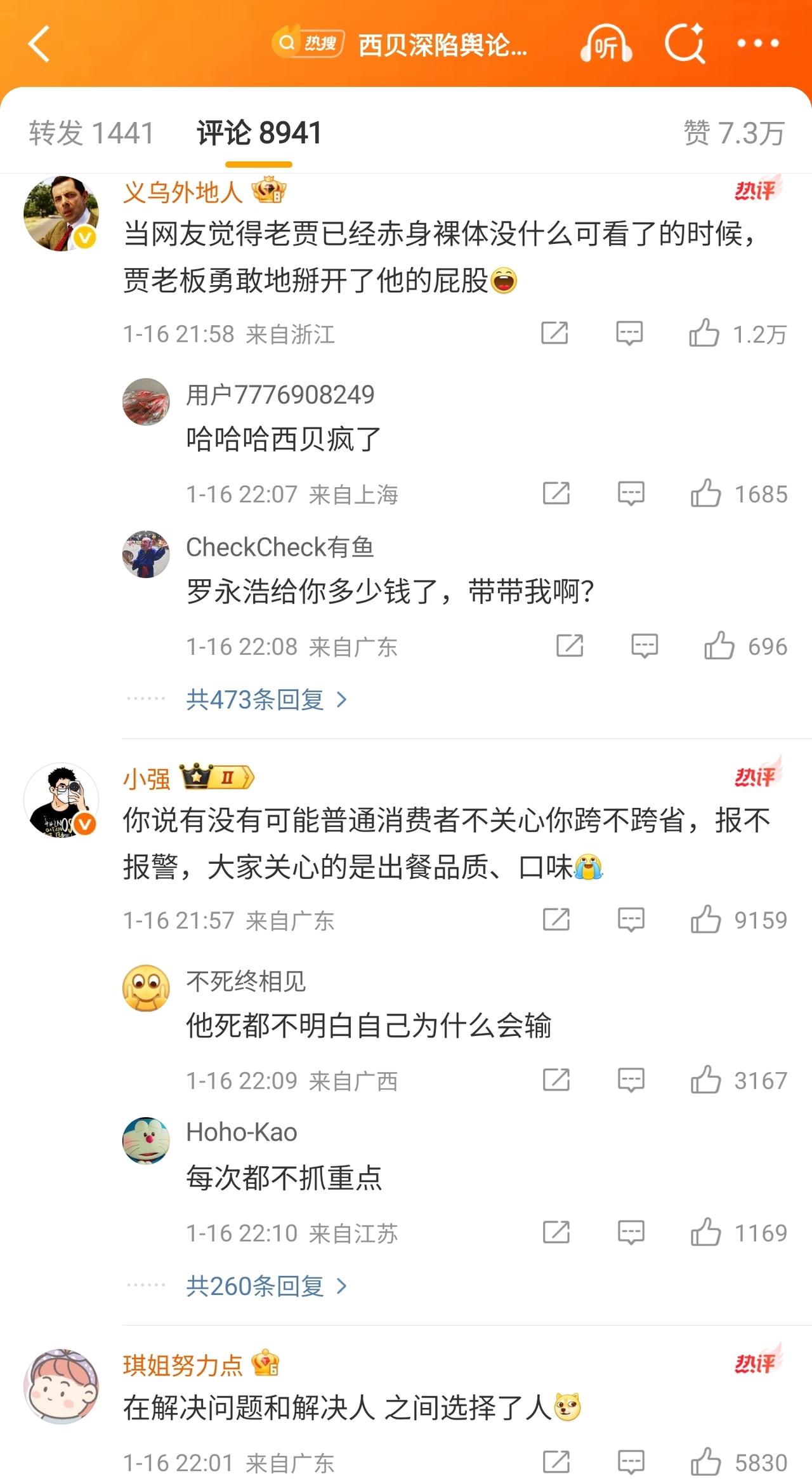 西贝贾国龙这个公关团队实在不行就换了吧。 什么跟什么呀?本来西贝好不容易熬到风波停下去了,然后客流量跟人气稍微回一点上来。 结果莫名其妙在年底就闹这么一出。 这下好了,两边都禁言了吧? 并且你看看评论区里边,扯东扯西,大家在乎你那点事吗?大家只想问问你,为什么明明是预制菜还不承认?而且还要卖那么贵? 弄明白这点就行了。 本来挺简单的一个事,非得闹得这么复杂,弄得大家好像非得跟你道歉一样。 以后都不去吃了,那不就得了。
