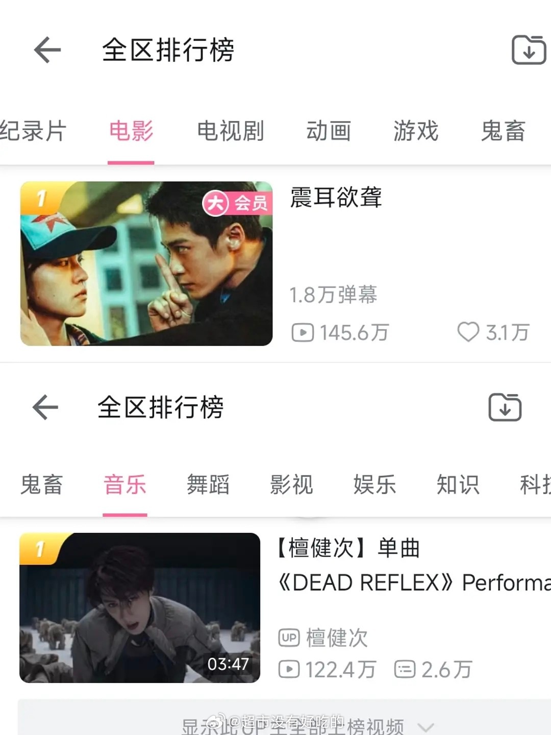 檀健次《DEAD REFLEX》上线2天144万进B站每周必看榜!开年三周唯一单人表演秀。震耳欲聋5000人同时在线,上线一周评分升至9.9 电影音乐双开花👏