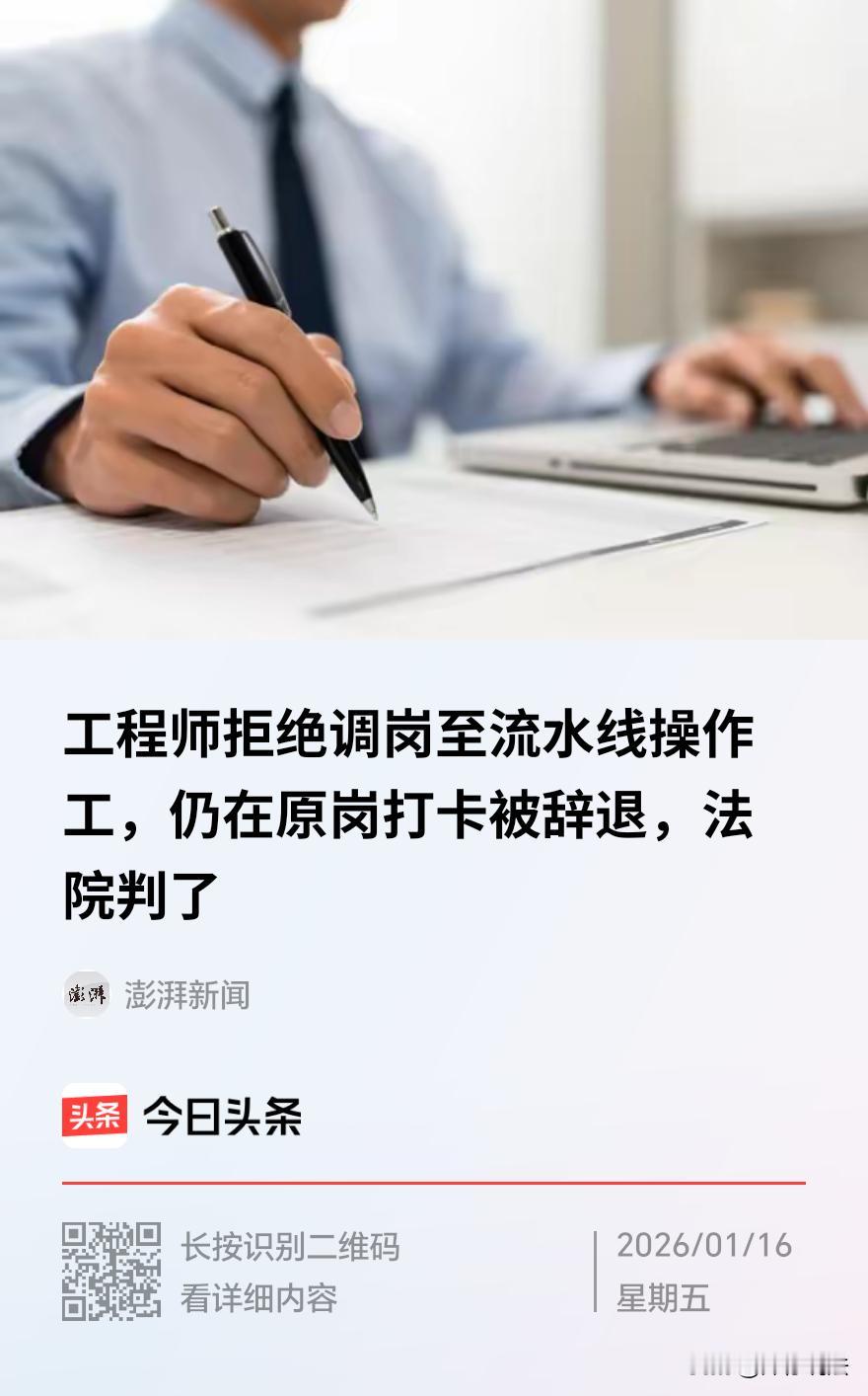 上海,一男子是某公司的工程师,突然收到一纸通知,因“经营变化”,他所在的岗位被取消,即日起调去生产线当操作工。尽管通知里写着“借调”和“可内部应聘”,但男子明白,这无异于让自己放下图纸去拧螺丝,他当即提出异议,公司却置之不理。面对不合理的安排,男子没有去流水线报到,但也没有离开,依然每天准时出现在自己熟悉的工程师办公室,像过去一样打卡、坐下。公司见状,以“连续旷工、不服从合理调遣”为由,将他开除。男子不服,申请劳动仲裁,要求确认公司违法解除,并支付赔偿金。仲裁委支持了男子,但公司不服,提起上诉。法院这样判决。 据悉,2024年8月,一封盖有公司鲜红印章的《人员分流安置通知函》,打破了沈先生作为技术公司工程师的平静职业生涯。 这份通知,告知沈先生因公司“经营情况发生变化”,他所在的岗位被取消。 等待沈先生的,不是协商,不是补偿方案,而是一项单方面决定:即刻起,沈先生被“借调”至生产部制造中心,担任流水线操作工。为期六个月。 通知还附带着一个看似给予机会、实则充满不确定性的“承诺”:借调期内可应聘内部其他岗位;若失败,借调期将延长至一年;一年后,则面临转岗、待岗或协商解除合同的未知命运。 沈先生拿着这纸通知,思绪翻涌,昨天,他还是负责技术方案、与图纸和数据打交道的工程师;今天,公司就要将他“安置”到节奏机械、重复体力劳动的流水线上。 沈先生当即向公司管理层提出了书面异议,质疑此次安排的合理性。 然而,沈先生的声音如同石沉大海,没有得到公司任何实质性的回应与协商。 面对公司的沉默与强势,沈先生陷入了两难。 如去流水线报到,那意味着默认接受这种近乎“惩罚性”的岗位变更,未来职业发展可能就此搁浅,专业能力将迅速荒废。 如直接离职,又心有不甘,且可能失去主张合法权益的机会。 经过慎重考虑,沈先生拒绝前往生产部报到,同时,依然每天准时出现在原工程师岗位所在的办公区,像往常一样,打卡、就坐。 在公司的考勤系统里,沈先生的打卡记录依然规律。但在公司管理层的眼里,这成了“不服从管理”的铁证。 公司认为,通知既已发出,新的岗位即已指定,沈先生不去新岗位出勤,便是“旷工”,便是“拒绝合理调遣”。 在履行了相关告知程序后,公司以严重违反规章制度为由,单方解除了与沈先生的劳动合同。 被解雇的沈先生没有选择沉默,他坚信公司的做法于法无据,于理不合,他提起了劳动仲裁,并获得了支持。 公司不服,一纸诉状告上法庭,请求法院确认其解除行为合法,无需支付赔偿。 法庭上,双方剑拔弩张。 公司方认为,取消部分岗位是经营自主权的体现,将沈先生“借调”至生产部门,是“人员分流安置”,是为了给他提供内部转岗的缓冲期和机会,属于合法行使用工管理权。 公司《员工手册》及劳动合同中,一般都有关于公司可根据经营需要调整岗位的概括性约定。沈先生拒不报到,连续旷工,严重违纪,解除合同合法合理。 沈先生则据理力争,认为公司所谓的“借调”,完全超出了劳动合同订立的初衷和劳动者可预期的范围,构成变相解除劳动关系。 法院会如何判决呢? 《劳动合同法》第四十条之规定,劳动合同订立时所依据的客观情况发生重大变化,致使劳动合同无法履行,经用人单位与劳动者协商,未能就变更劳动合同内容达成协议的,用人单位可依法解除劳动合同并支付经济补偿。 法院指出,公司并未提供充分证据证明其经营情况发生了足以导致沈先生工程师岗位灭失、劳动合同无法继续履行的重大变化。 更为关键的是,即便存在经营调整的需要,根据《劳动合同法》第三十五条确立的“协商一致”原则,变更劳动合同内容应首先由双方协商。 法院认为,公司单方面发出《人员分流安置通知函》,其内容为单方决定,虽给予沈先生内部应聘机会,但主岗位已强制变更为操作工,且在沈先生当即提出异议后未作任何回应与协商,程序上欠缺正当性。 双方劳动合同中虽有用人单位可根据需要调整岗位的概括性约定,但该约定不能排除法律对调岗合理性的具体要求,更不能成为用人单位随意变更劳动者核心工作内容的“万能条款”。 此外,在调岗安排本身不合理的前提下,沈先生拒绝到岗系对其合法权益的正当维护,其持续在原岗位打卡的行为,表明其仍在提供劳动、遵守基本考勤纪律的主观意愿,不能简单等同于“无正当理由拒不到岗”的旷工行为。 法院进一步认为公司以旷工为由解除劳动合同,缺乏事实基础。 结合《劳动合同法》第四十八条及第八十七条,该解除行为构成违法解除,应依法支付赔偿金。 最终,法院认定公司解除行为违法,判决其支付赔偿金25万余元。 对此,您怎么看?