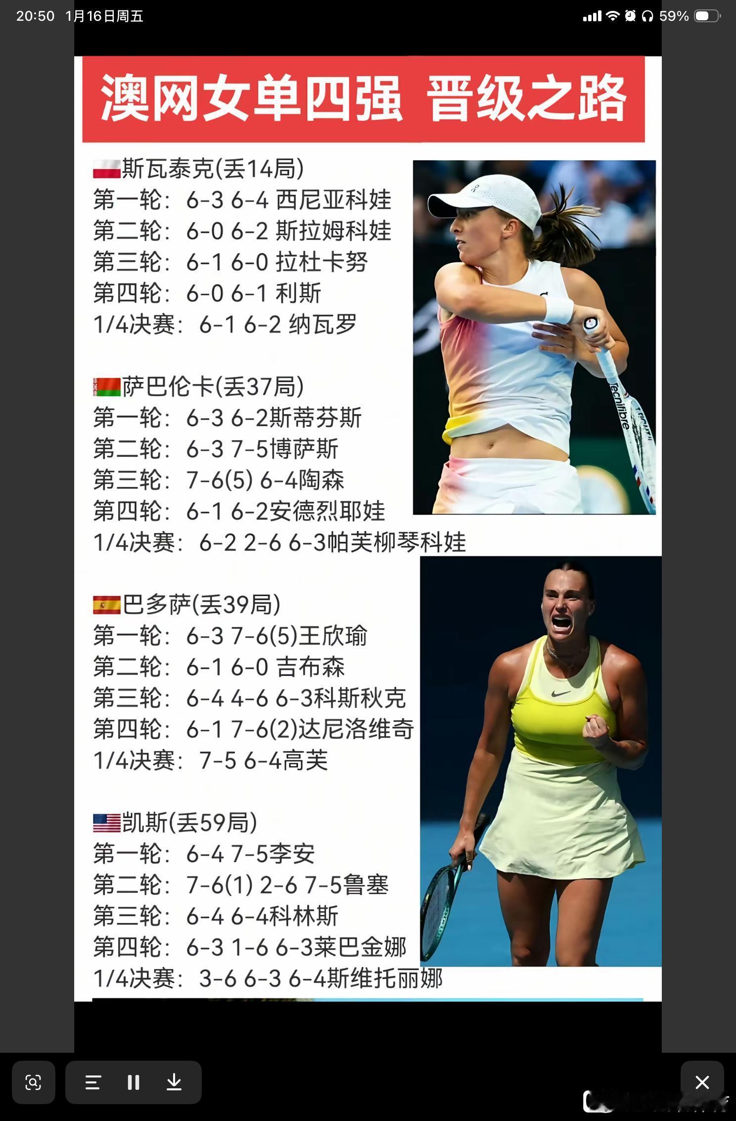 澳网去年的四强斯瓦泰克(丢14局)第一轮6-3 6-4 西尼亚科娃第二轮6-0 6-2 斯拉姆科娃第三轮6-1 6-0 拉杜卡努第四轮 6-1 6-2 利斯4/1决赛 6-1 6-2 纳瓦罗萨巴伦卡 (丢37局)第一局6-3 6-2 斯蒂芬斯第二局6-3 7-5 波萨斯第三局7-5 6-4 陶森第四局6-1 6-2 安德烈耶娃4/1决赛 6-2 2-6 6-3 帕夫柳琴科娃巴多萨 ( 丢39局 )第一轮6-3 7-5 王欣瑜第二轮6-1 6-0 吉布森第三轮6-3 4-6 6-3 科斯秋克第四轮6-1 7-2 达尼洛维奇 4/1决赛7-5 6-4 高芙凯斯 (丢59局)第一轮6-5 7-5 李安第二轮7-1 2-6 7-5 鲁赛第三轮6-4 6-4 科林斯第四轮6-3 1-6 6-3莱巴金娜4/1决赛 3-6 6-3 6-4 斯维托丽娜这四个是去年的澳网四强,今年有几个能进呢,你们觉得,而且这个凯斯今年够呛吧。这很澳网澳网2026体坛高能时刻