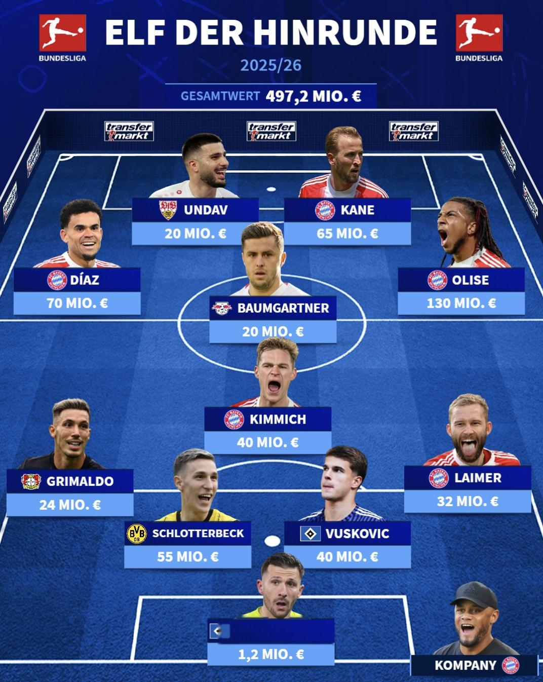 本季德甲半程表现最佳阵容:拜仁5将入选;奥利塞1.3亿领衔