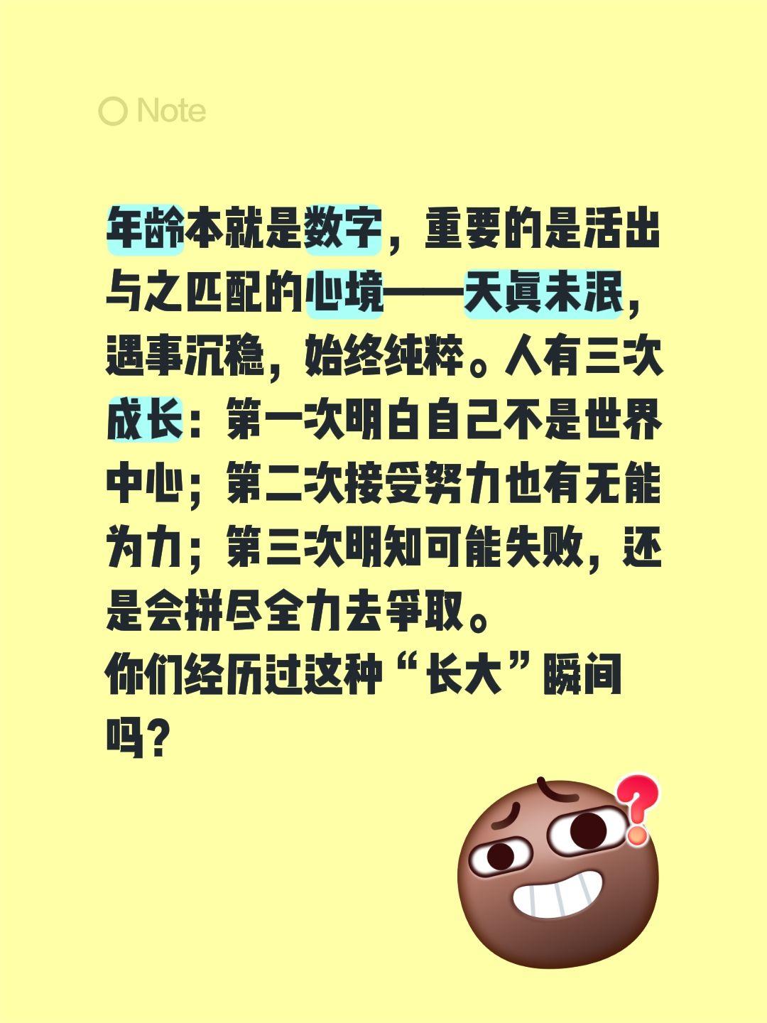年龄本就是数字,重要的是活出与之匹配的心境——天真未泯,遇事沉稳,始终纯粹。人有三次成长:第一次明白自己不是世界中心;第二次接受努力也有无能为力;第三次明知可能失败,还是会拼尽全力去争取。 你们经历过这种“长大”瞬间吗?