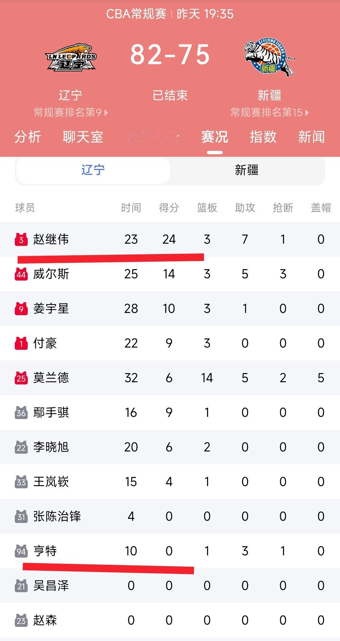辽宁男篮82:75战胜新疆男篮,我却一点儿高兴不起来。伤愈复出的赵继伟全场比赛拿到24分固然令人欣慰,但是看到辽宁男篮挑小外援的眼光又感觉到很不争气。 全场比赛亨特竟然到了0分,助攻与篮板也没有多少,打球的态度看起来无精打采。相比之下南京同曦挑选的新外援就很给力,昨天爆冷大胜深圳男篮。见此情景还是希望辽宁男篮接下来挑选外援的时候还是要用心,要不然进季后赛依然很难。