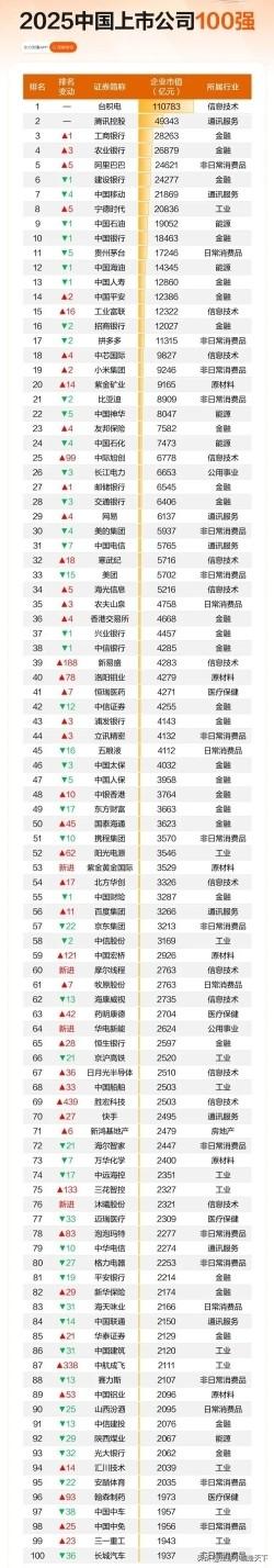 带你了解中国上市公司100强!话说这台积电这么牛逼吗? 其实有人就要说了,台积电不是台湾的吗?也能算进去?不应该就算大陆的企业吗? 那我就要说了,台湾只是中国的一个省,最大的岛屿,怎么就不能算进去?港澳台的都可以算进去啊。 不过咱们还是小看看国内的企业吧,这里面央企国企占了一半。 而且以前前二十有四家地产企业,现在房地产萎缩,都歇菜了。
