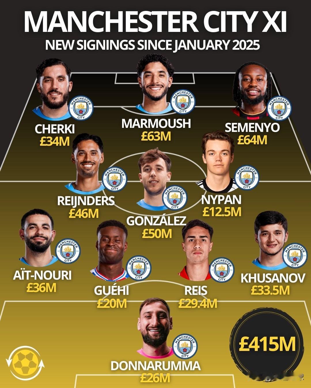 当曼城以2000万英镑签下马克格伊后,他们可以排出一套完全由2025年1月之后引进的球员组成的首发11人阵容。 换句话说,过去一年,他们又签了一支球队,这套阵容的总价值将达到4.15亿英镑。