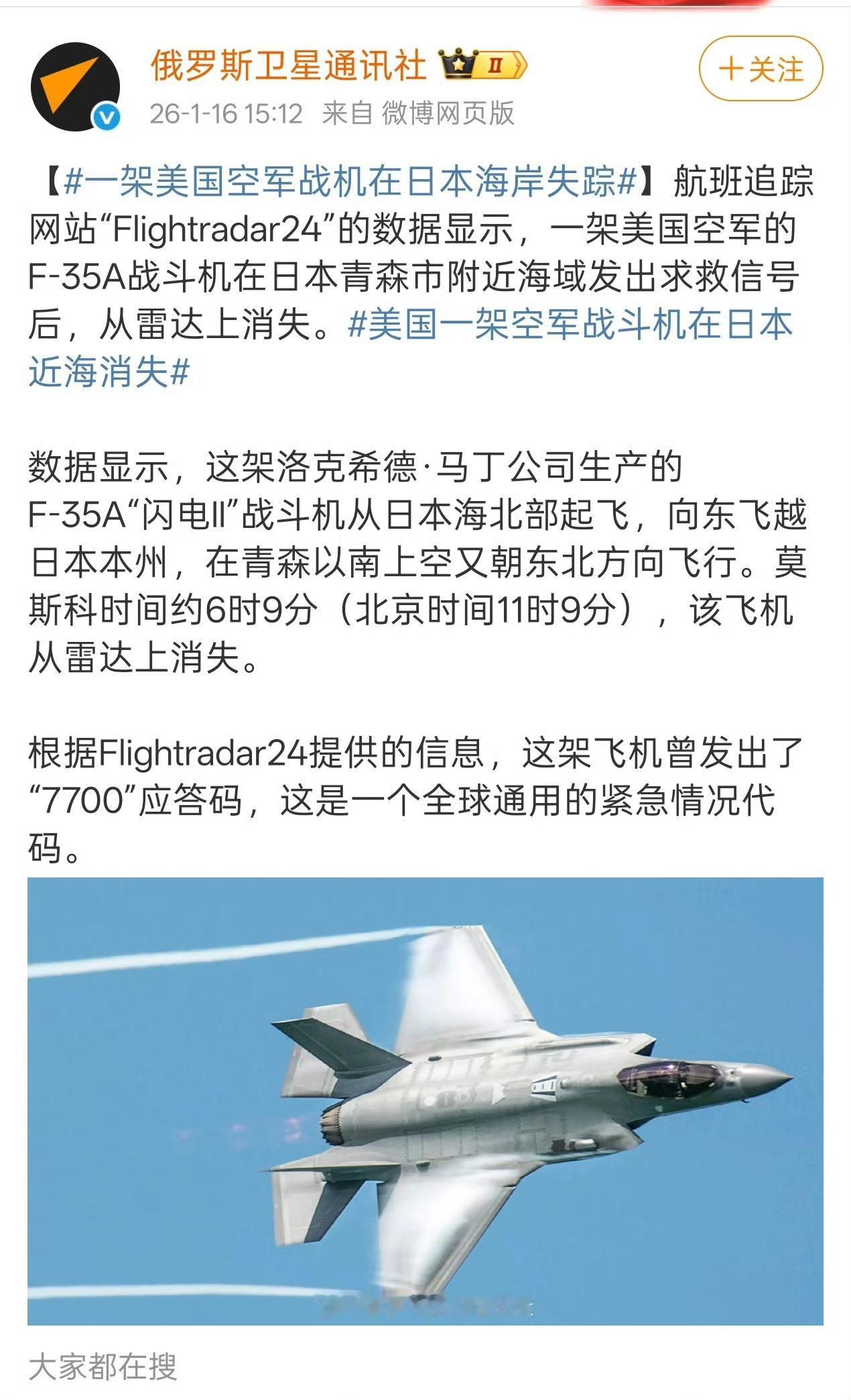 漂亮国空军又掉了一架F35A,坠毁位置在倭国青森市海域附近海域,2026开斋。一年前的1月28日,阿拉斯加州埃尔森空军基地(训练着陆阶段,液压油结冰致起落架异常)。 F35系列近年已损失多架,其可靠性变得模糊。加上稀土管制,新机制造速度不得不变得非常慢。