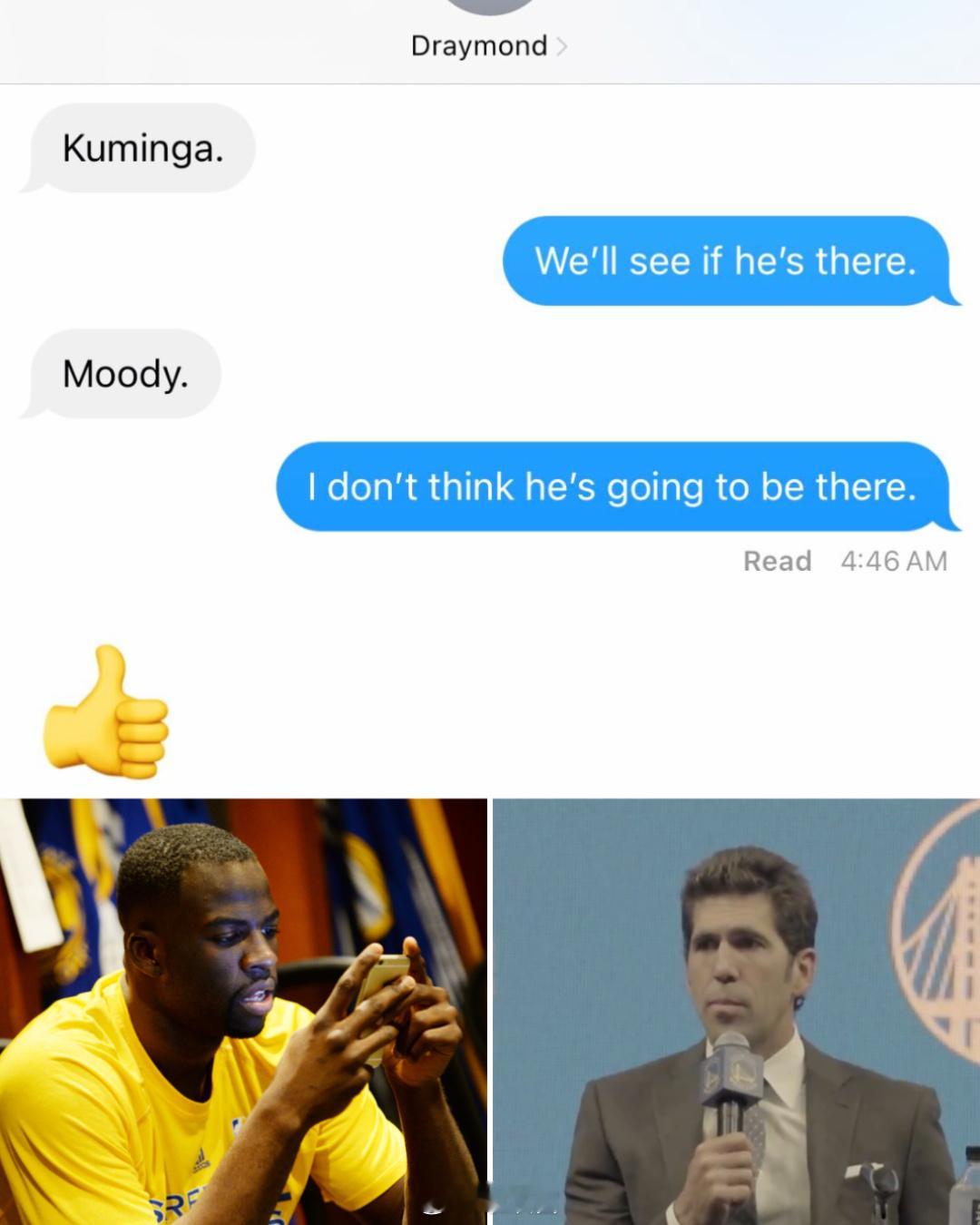 勇士前GM鲍勃·迈尔斯透露,2021年选秀前,格林在凌晨四五点给他发选人建议,其中包括库明加和莫迪,迈尔斯回消息称不确定他们还能选到,但最终都选到了。如果属实,等于格林招募来了杜兰特,还主导了选秀,还当啥教练,直接干GM啊
