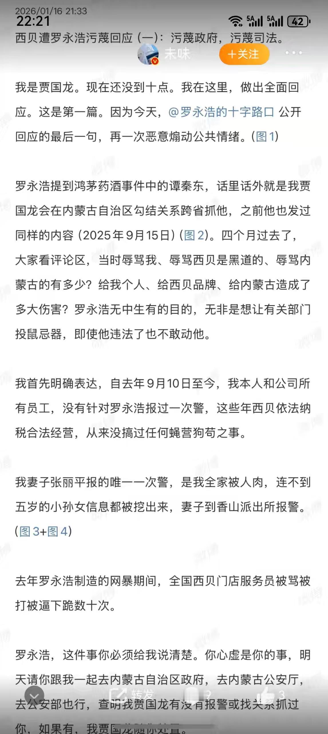 罗永浩和贾国龙在某博被禁言了, 这是真的。 前天贾国龙说“西贝”关门了, 自己的企业是被网红“黑”垮了的。 老罗昨天发小作文回应, 没有哪家的企业是被人“黑”垮的, 他自己的“锤子”公司就是自己经营失败的, 老罗坦诚自己的失败, 不甩锅任何人。 贾国龙昨天下午喊话要老罗道歉, 明确说晚上会发文回答一些问题。 一看就是要约架啊, 他现在就像一个输红眼的赌徒, 失去了理智, 这是要和老罗不死不休啊。 但是老罗回应表示, 自己现在克制, 后退一步。 相信老罗不是怂, 而真的是“嘴下留情”。 贾国龙做人管理企业的失败, 不该西北员工买单。 贾国龙不能代表“西贝”, “西贝”不能倒闭。 所以老罗退让了。 随着晚上九点多贾国龙的第一篇小作文出来之后, 某博的老板也发文表示, 网络名人以后想论战, 应该还是需要通过媒体采访的方式来进行。 大概意思就是想要约架去线下, 不要挑起网络戾气, 占用公共资源。 于是乎, 老罗和贾国龙都被禁言了。 来总这一操作绝了, 不准他们两个继续这样开撕, 还网络一个安静, 其实也是在保护“西贝”。 贾国龙现在已经有些丧失理智了, 不管不顾只想和老罗开战, 即使最后搭上“西贝”, 他也在所不惜的状态。 论打嘴炮, 老罗没输过, 贾国龙还真的不是老罗的对手。 现在贾国龙说的越多错的也会越多, 对“西贝”的伤害也越大。 所以禁言何尝又不是对“西贝”的一种保护。 贾国龙作为“西贝”的创始人, 一次又一次的“自杀”式的公关, 才把自己和公司逼到现在这个状态。 他不认真的反思自己, 再一次对老罗开炮, 把自己的失败归错于别人, 这是在最后的“自宫”。 贾国龙一如既往的傲慢, 和很多的老登企业家一样。 只是在面对同样的危机的时候, 一些企业家的公关方式是保持沉默, 而他选择的是和网民硬刚, 所以他走到今天的地步, 我不觉得他无辜! 不过我也希望西贝不要倒闭, 毕竟还关乎着几千员工的生计! 散会! 西贝现状 西贝贾老板