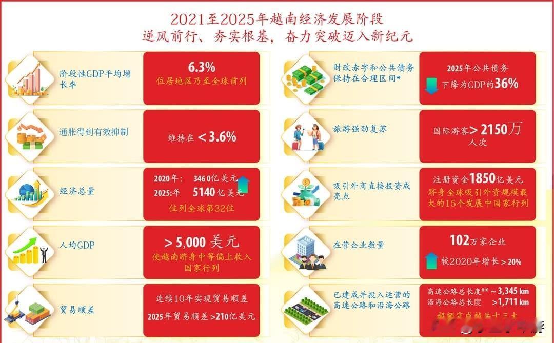 2021—2025年阶段,在世界局势复杂多变的背景下,越南宏观经济保持总体稳定,充分彰显了越南经济的韧性与抗风险能力。 (数据源自网络,仅供参考) 越南经济