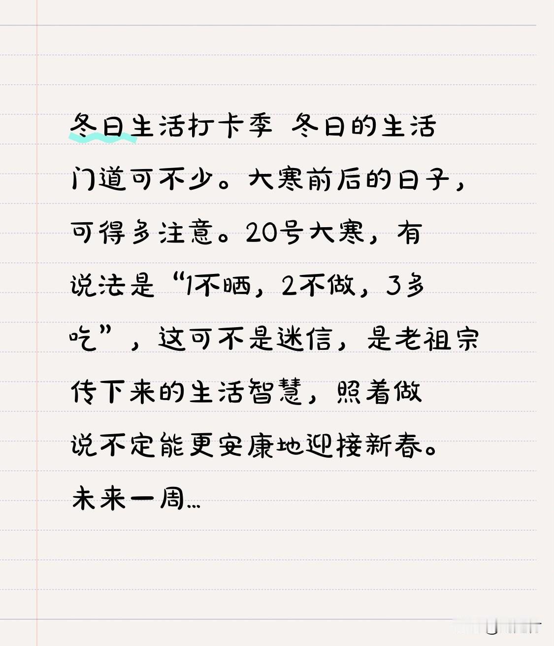 冬日生活打卡季 冬日的生活门道可不少。大寒前后的日子,可得多注意。20号大寒,有说法是“1不晒,2不做,3多吃”,这可不是迷信,是老祖宗传下来的生活智慧,照着做说不定能更安康地迎接新春。 未来一周,中老年朋友也得留意。像提醒里说的2物少囤,3物不吃,4事不做,做好这些细节,才能平平安安地度过腊月。冬日虽冷,但只要多注意生活中的小细节,也能过得有滋有味,舒舒服服地打卡这个冬日。
