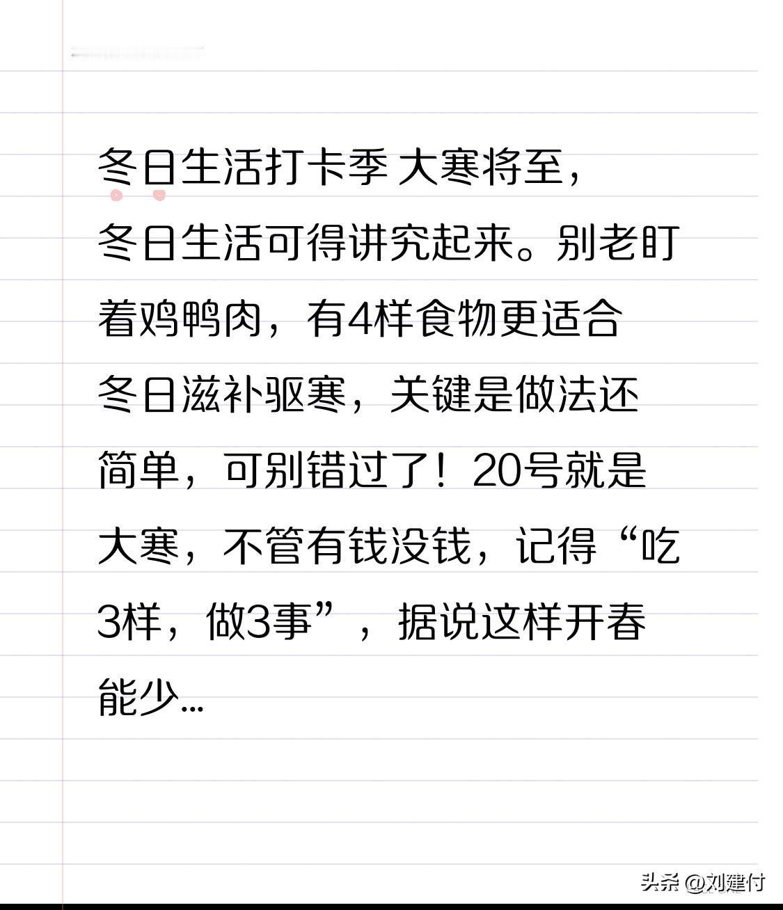 冬日生活打卡季 冬日生活打卡季 大寒即至,这冬日生活可得多些讲究。别总只盯着鸡鸭肉,有4样食物更适宜冬日滋补驱寒,关键是做法简便,可别错过! 20号便是大寒,无论手头宽裕与否,记得“吃3样,做3事”,据说如此开春能少生病。冬天本就该好好调养身体,为来年的健康筑牢根基。在这个冬日生活打卡季,将这些养生小秘诀付诸实践,说不定就能温暖又健康地熬过寒冷时光。大家也赶快试试,一起在冬日里好好疼爱自己!