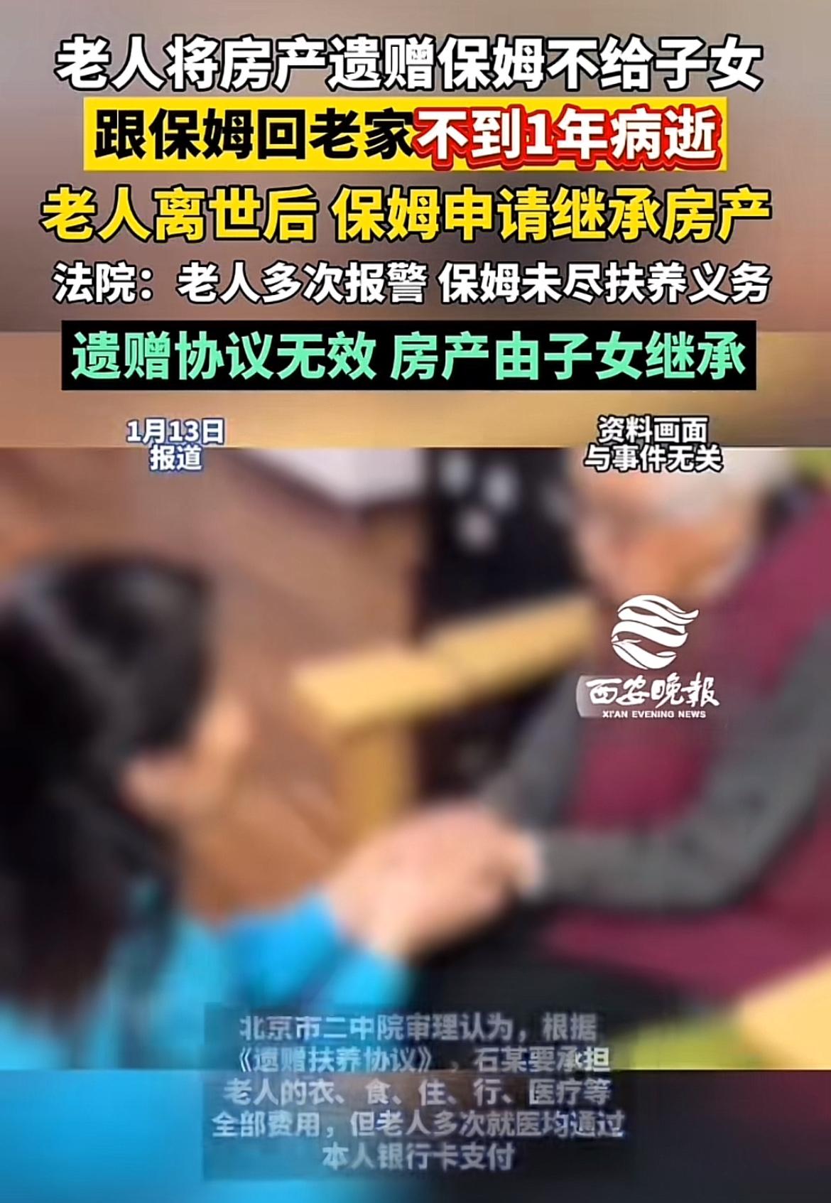现在越来越多的老人会考虑和保姆签《遗赠抚养协议》来解决养老问题,可这协议真不是万能的。就说北京这位李某老人,2019年底雇了保姆石某,2021年初跟保姆回了老家,还签了协议把房产赠给石某。结果呢,不到一年老人就病逝了。 石某起诉要继承房产,可法院一查,老人的医疗等费用大多是用自己银行卡支付,石某证明尽赡养义务的证据也不连贯,而且老人病逝前还多次报警。最终法院认定石某没尽到扶养义务,协议无效,房产由子女继承。看来,签了协议也得好好履行义务,不然这遗产可拿不到手。