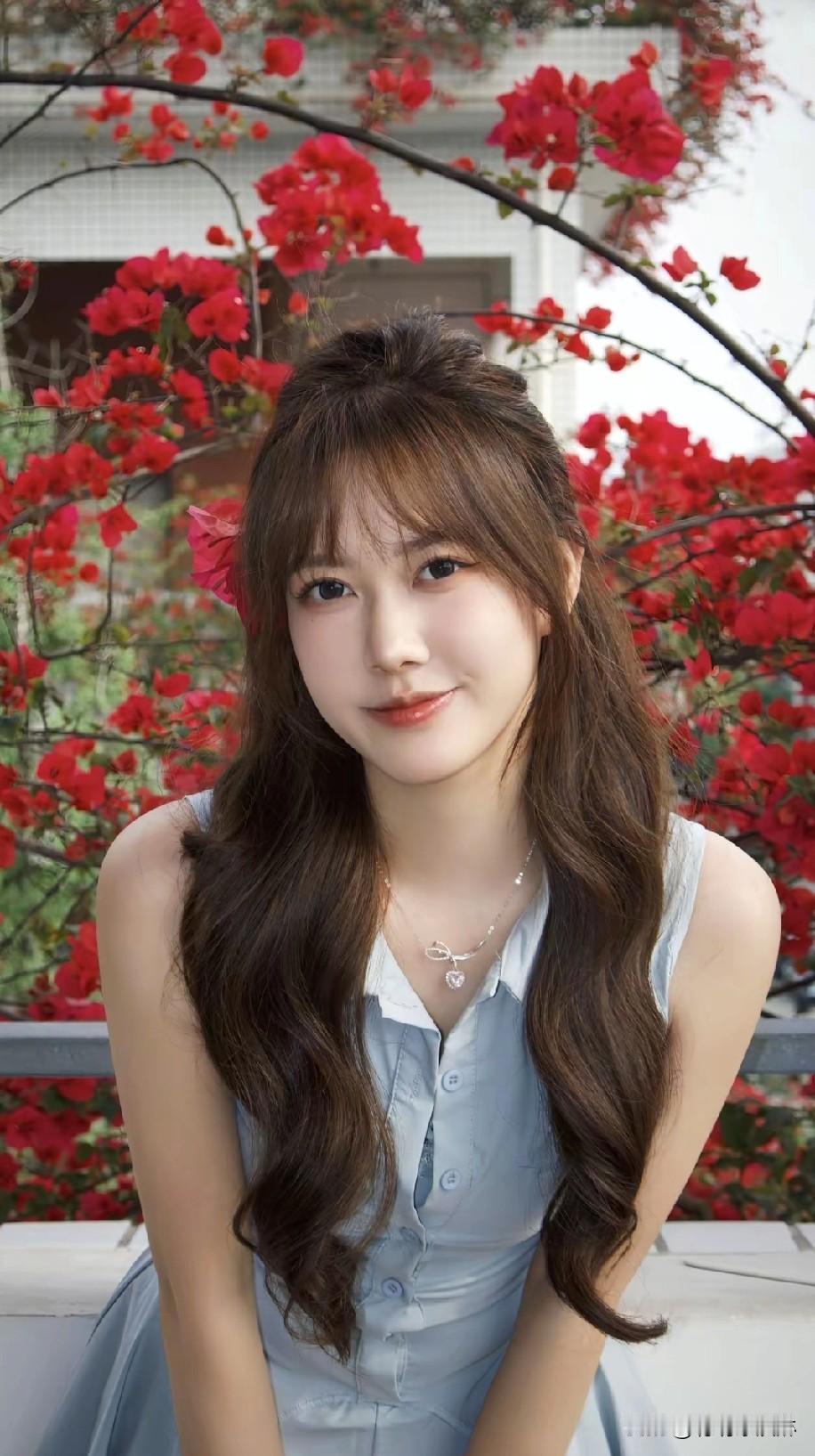 甜美少女风,蓝白连衣裙,花海背景,清新自然。