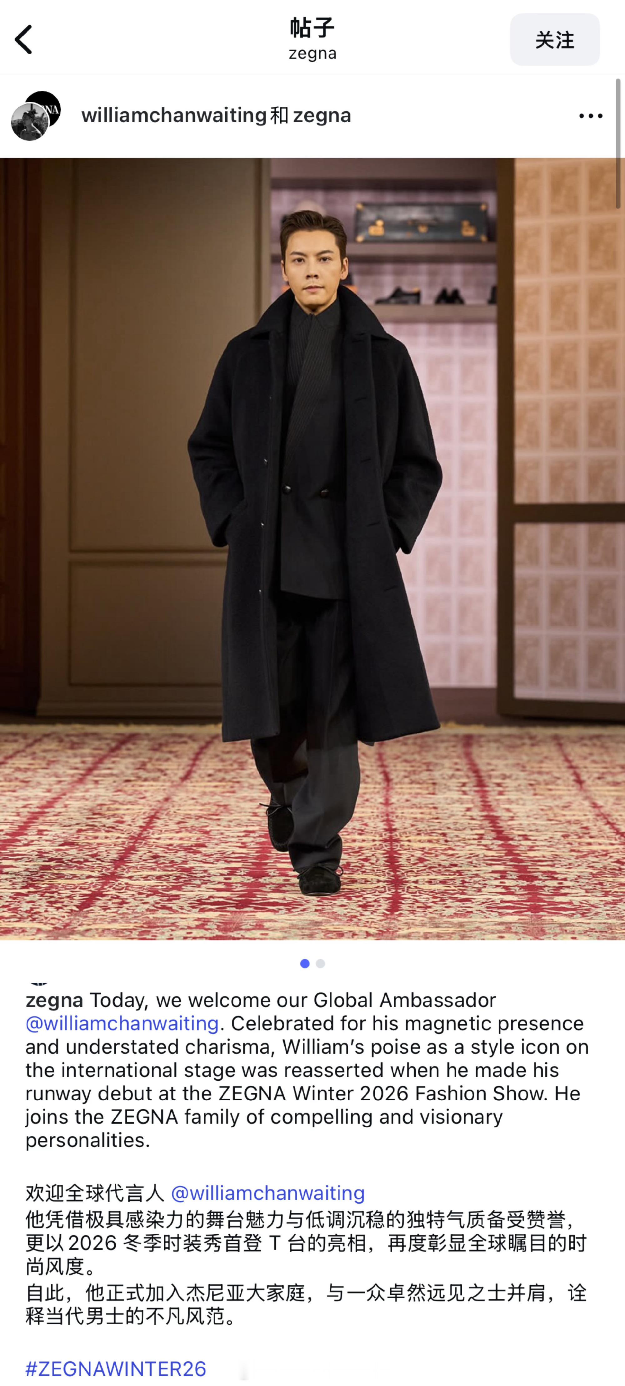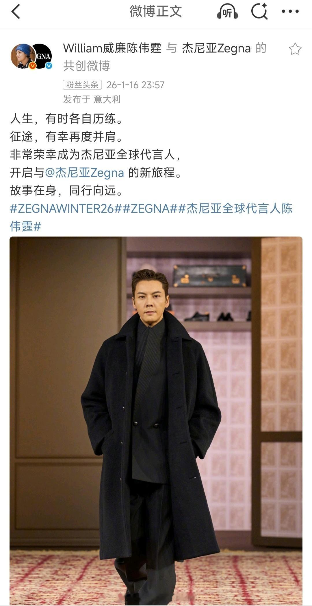 杰尼亚内外网同步官宣,陈伟霆正式荣耀回归杰尼亚Zegna大家庭(回签)!本次米兰男装周陈伟霆为男装顶奢品牌杰尼亚Zegna2026秋冬大秀压轴走秀,是陈伟霆的T台首秀,也是有此待遇的第一位亚洲明星👏品牌方用这一独特的方式向全世界宣告陈伟霆的回归!陈伟霆米兰走秀