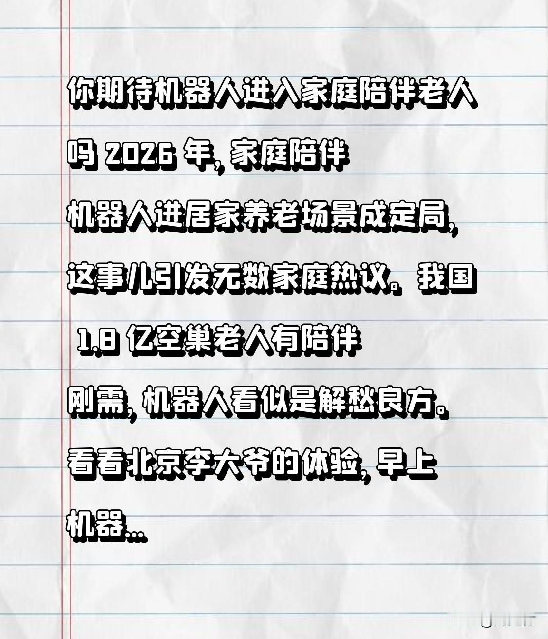 你期待机器人进入家庭陪伴老人吗 你期待机器人走进家庭陪伴老人吗?2026 年,家庭陪伴机器人进入居家养老场景已成定局,这一消息引发了无数家庭的热烈讨论。我国 1.8 亿空巢老人对陪伴有着迫切需求,机器人似乎是解决这一难题的好办法。 看看北京李大爷的使用体验,清晨,机器人会叫醒他起床,提醒他添加衣物,还会帮他起身;上午,它会提醒李大爷测量血压,并将数据同步给其子女;它能做出软烂美味的老人餐,还拥有强大的防跌倒功能。主流机器人具备方言交互、健康监测等功能,还能与智能家居实现联动。 此外,新政将适老化智能设备纳入以旧换新补贴范围,北京、杭州等地最高补贴达 30%。对子女来说,机器人是“安全卫士”和健康管家;对老人而言,它能缓解内心的孤独。我觉得这是件好事,非常期待机器人走进家庭陪伴老人。