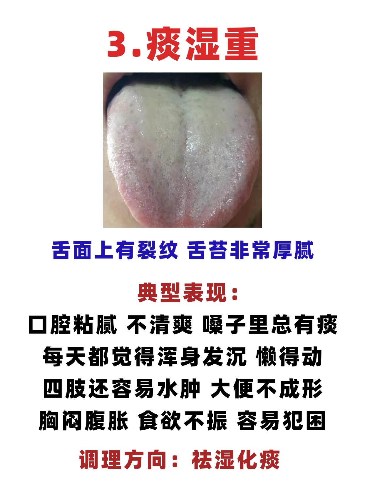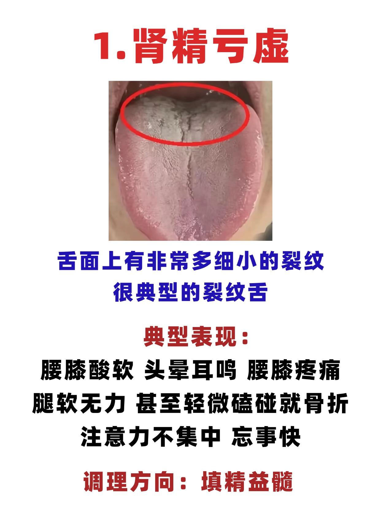 舌头有裂纹,就是肾精亏虚?教你认识,四种裂纹舌,简单一招修复它! 1.肾精亏虚 舌象:舌面上有非常多细小的裂纹很典型的裂纹舌 典型表现:腰膝酸软 头晕耳鸣 腰膝疼痛腿软无力 甚至轻微磕碰就骨折 注意力不集中 忘事快露 调理方向:填精益髓 2.阴虚火旺 舌象:舌面颜色比较红 舌苔很少 典型表现:五心烦热 潮热盗汗 晚上睡觉偷偷出汗 失眠多梦 喉咙干咽燥 小便发黄 大便干结 头晕耳鸣 调理方向:滋阴降火 3.痰湿重 舌象:舌面上有裂纹 舌苔非常厚腻 典型表现:口腔粘腻不清爽 嗓子里总有痰 每天都觉得浑身发沉 懒得动 四肢还容易水肿 大便不成形 胸闷腹胀 食欲不振 容易犯困 调理方向:祛湿化痰 4.血虚 舌象:舌头的颜色较淡 舌体也偏瘦小 典型表现:神疲乏力 少气懒言不想说话 稍微动一动就累头晕耳鸣 失眠多梦露面色苍白或萎黄 嘴唇颜色偏淡 调理方向:补血养血