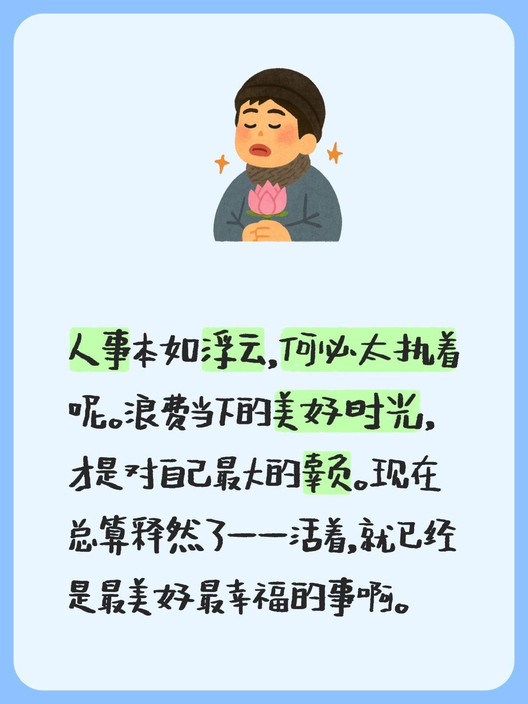 人事本如浮云,何必太执着呢。浪费当下的美好时光,才是对自己最大的辜负。现在总算释然了——活着,就已经是最美好最幸福的事啊。