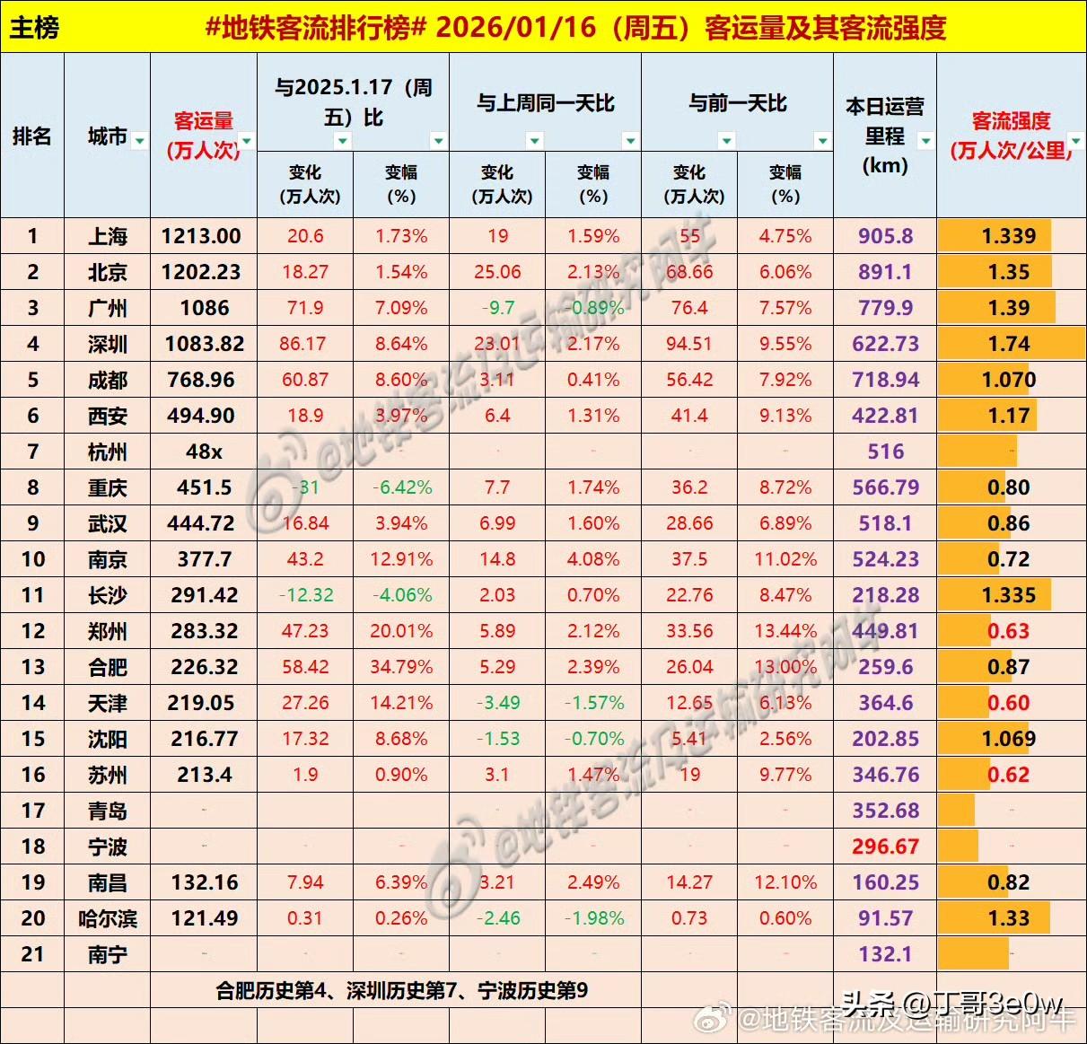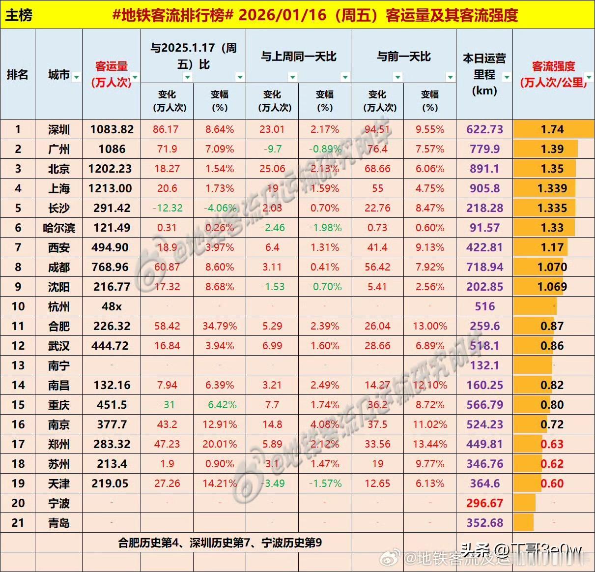 新线路开通首日,宁波地铁客流量周五突破132万人次以上,历史第九高 爆料 身边事 周五 排行榜 宁波 2026年1月16日 星期⑤ 全国重点城市轨道交通客流量排行榜: 上海:1213.00万 北京:1202.23万 广州:1086.00万广州地铁 深圳:1083.82万深圳爆料 成都:768.96万 西安:494.90万西安地铁 杭州:480万+杭州爆料 重庆:451.50万重庆身边事 武汉:444.72万武汉地铁 南京:377.70万南京身边事 长沙:291.42万长沙爆料 郑州:283.32万 合肥:226.32万合肥地铁 天津:219.05万天津地铁 沈阳:216.77万 苏州:213.40万苏州爆料 青岛:132万+青岛身边事 宁波:132万+宁波地铁 南昌:132.16万 哈尔滨121.49万哈尔滨爆料 南宁:100万+
