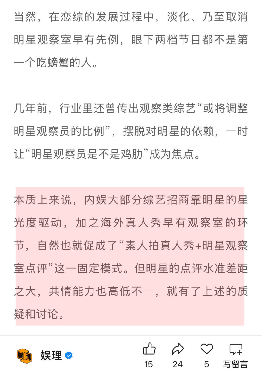 中老年恋综一分钟800个心眼子 恋综正在抛弃明星观察员 在恋综的发展过程中,淡化、乃至取消明星观察室早有先例,《日落时分说爱你》和《势均力敌的我们2》都不是第一个吃螃蟹的人。这两档节目都省去了明星观察室的篇幅,要么将嘉宾点评放在了正片之外,要么直接把内容原汁原味地呈现在观众面前…娱理独家↓